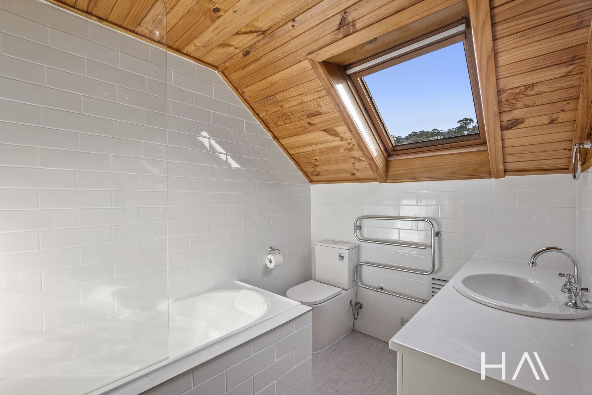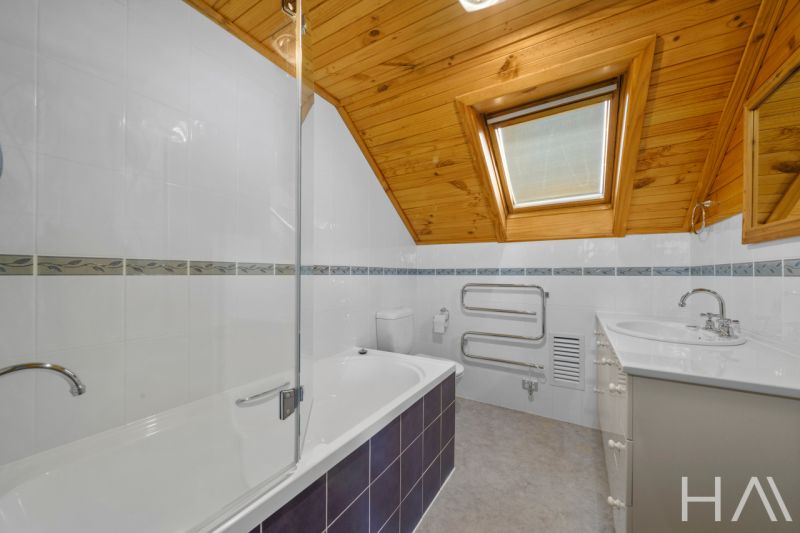 - Upstairs bathroom featured a shower over the bath, toilet and vanity.