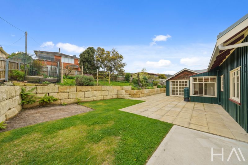 - Sandstone patio area, sandstone walls and a landscaped garden.