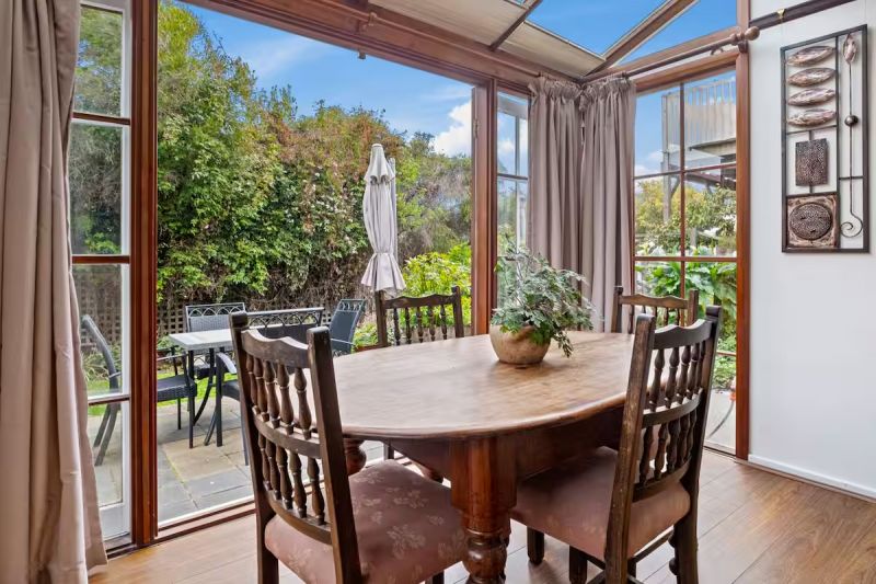 The formal lounge and dining area offer a welcoming retreat, complete with Smart TV and Netflix access. French doors open to a private patio and established garden, creating seamless indoor-outdoor flow — perfect for relaxed evenings or weekend entertaining.