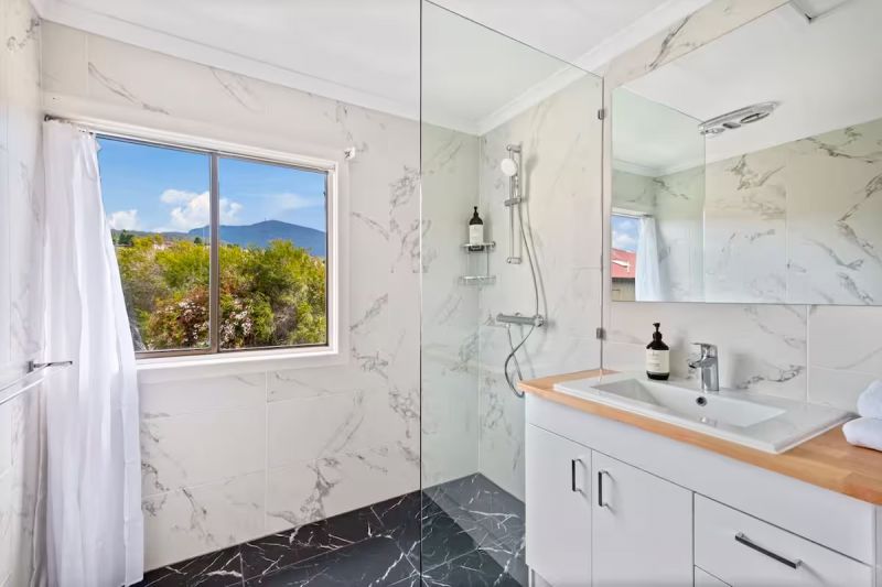 Both bathrooms capture stunning outlooks toward Mount Wellington, providing that iconic Hobart backdrop.