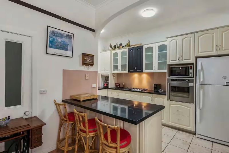 The well-equipped kitchen features stone benchtops, gas cooking, dual dishwasher, full-size fridge, microwave, rice cooker and coffee machine — ideal for preparing fresh Tasmanian produce at home.