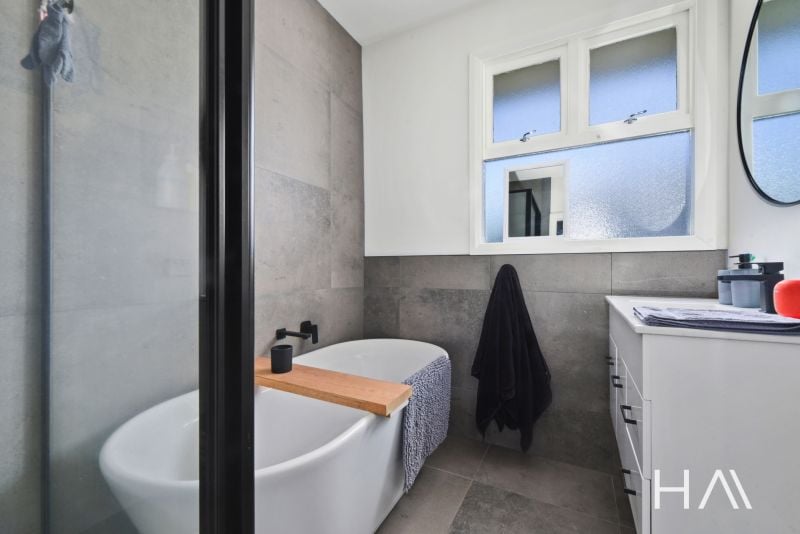 - Stylish, tiled bathroom with a separate bath and shower, offering a relaxed space to unwind