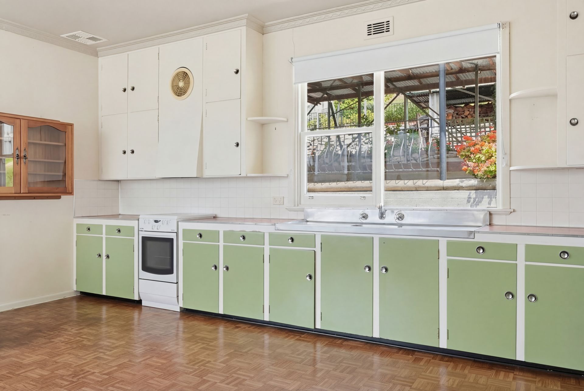 - Retro-style kitchen and dining area with functional layout and scope to update