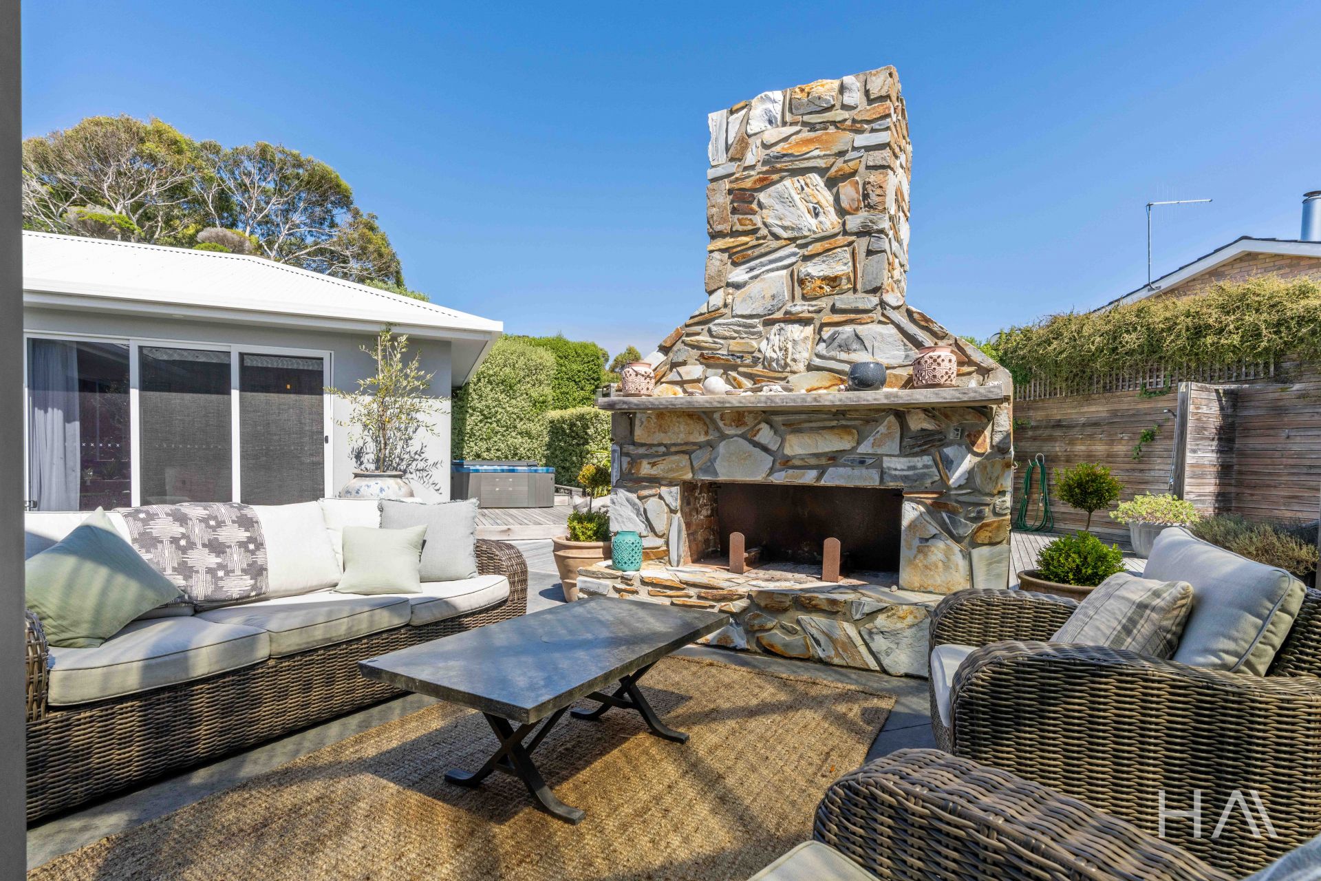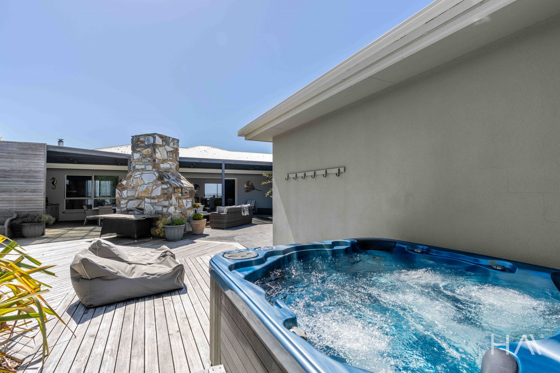 The property's outdoor amenities extend beyond these spaces, with an adjacent spa area and a stunning open stone-built fireplace, enhancing the atmosphere of luxury and leisure. Whether hosting guests or enjoying peaceful solitude, this home epitomises coastal living at its finest.