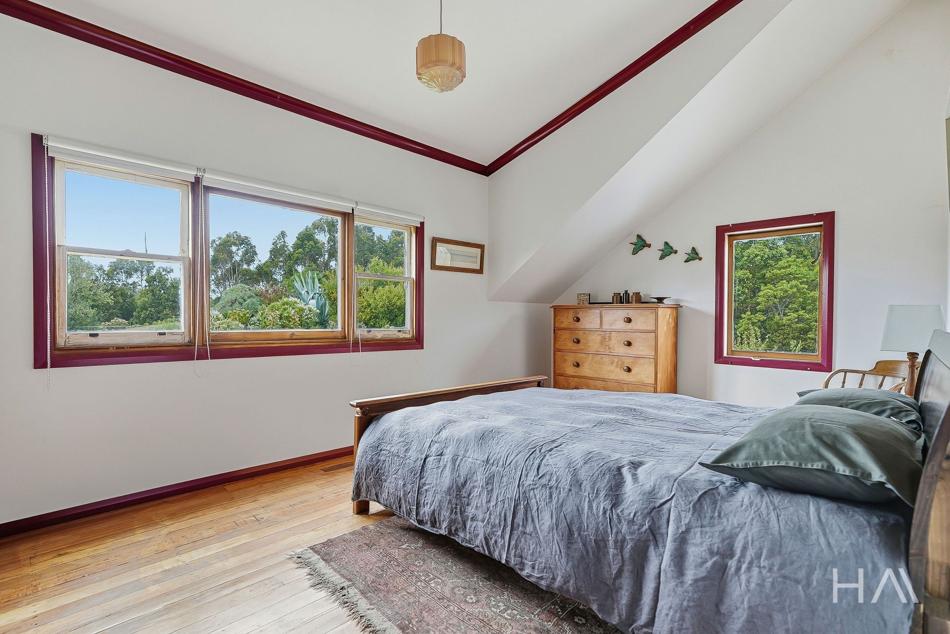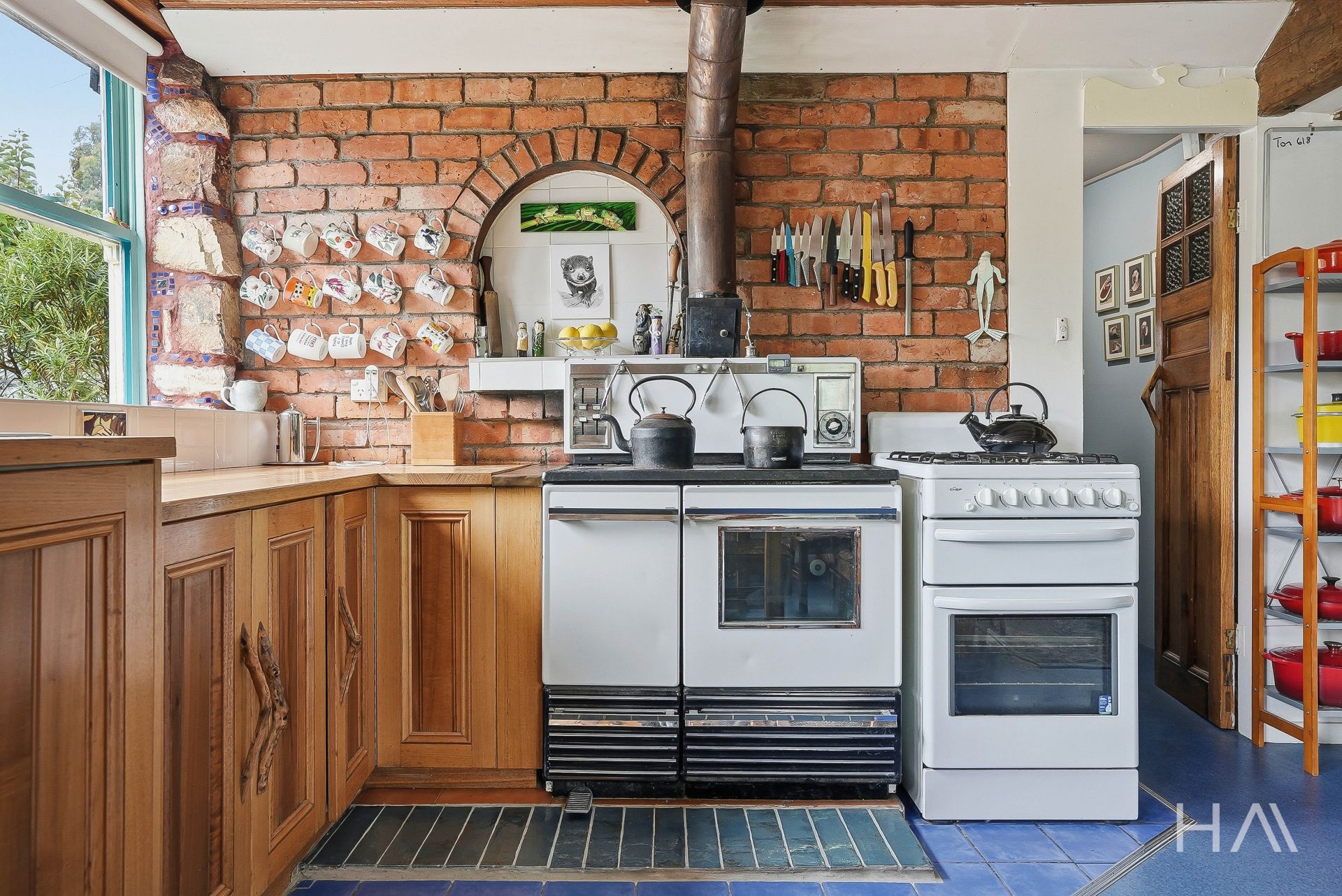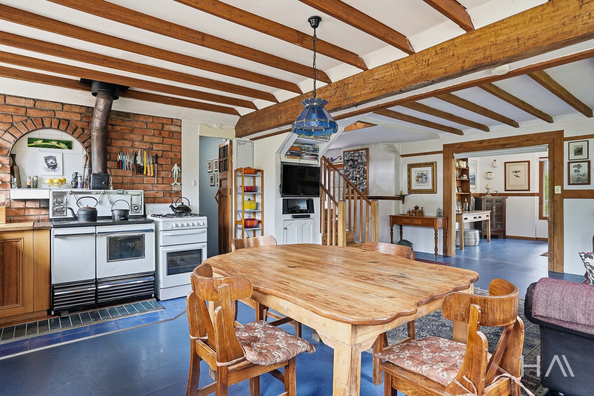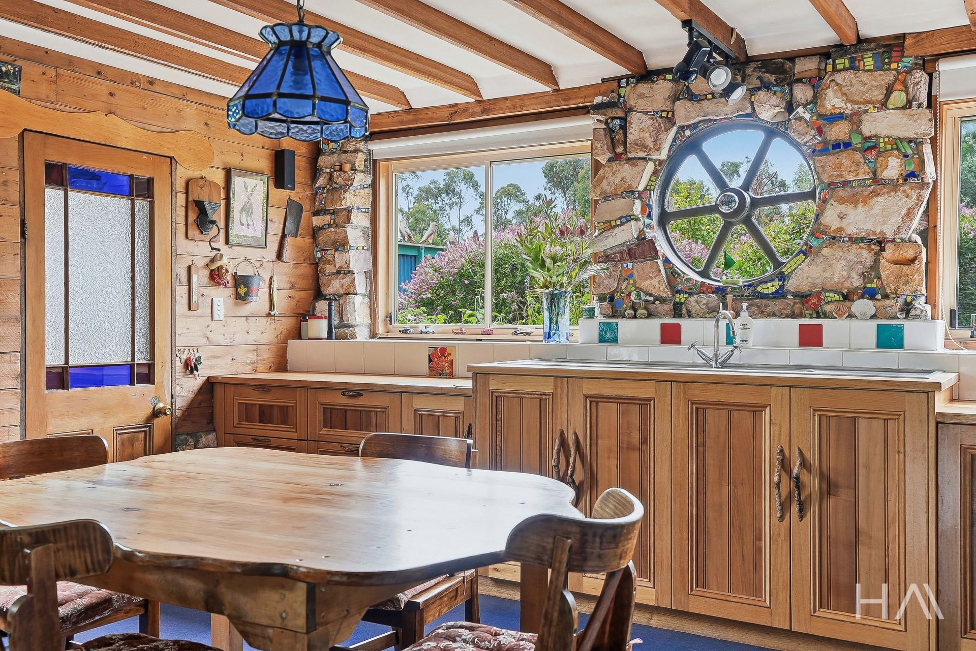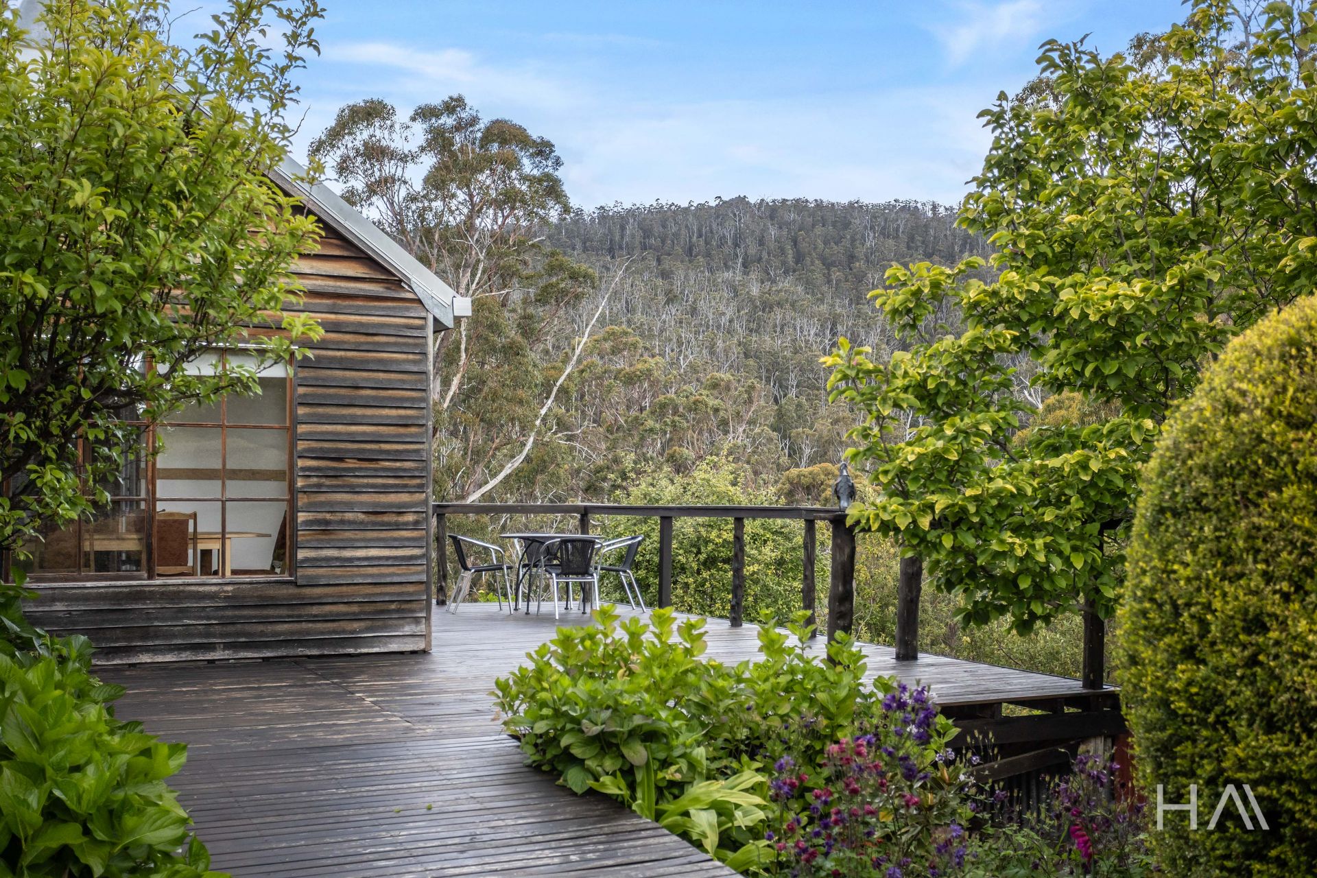 The timber kitchen is full of character, with generous preparation space and a practical country feel, perfect for homegrown produce and slow living. It features a gas stove and a working Everhot wood stove, offering flexible cooking options to suit any season or preference. Outside, a sun-drenched deck provides a peaceful place to unwind after a day spent tending the gardens or exploring the property. From here, enjoy the stunning private views of Huntsmans Cap, one of the region's most enchanting natural backdrops.