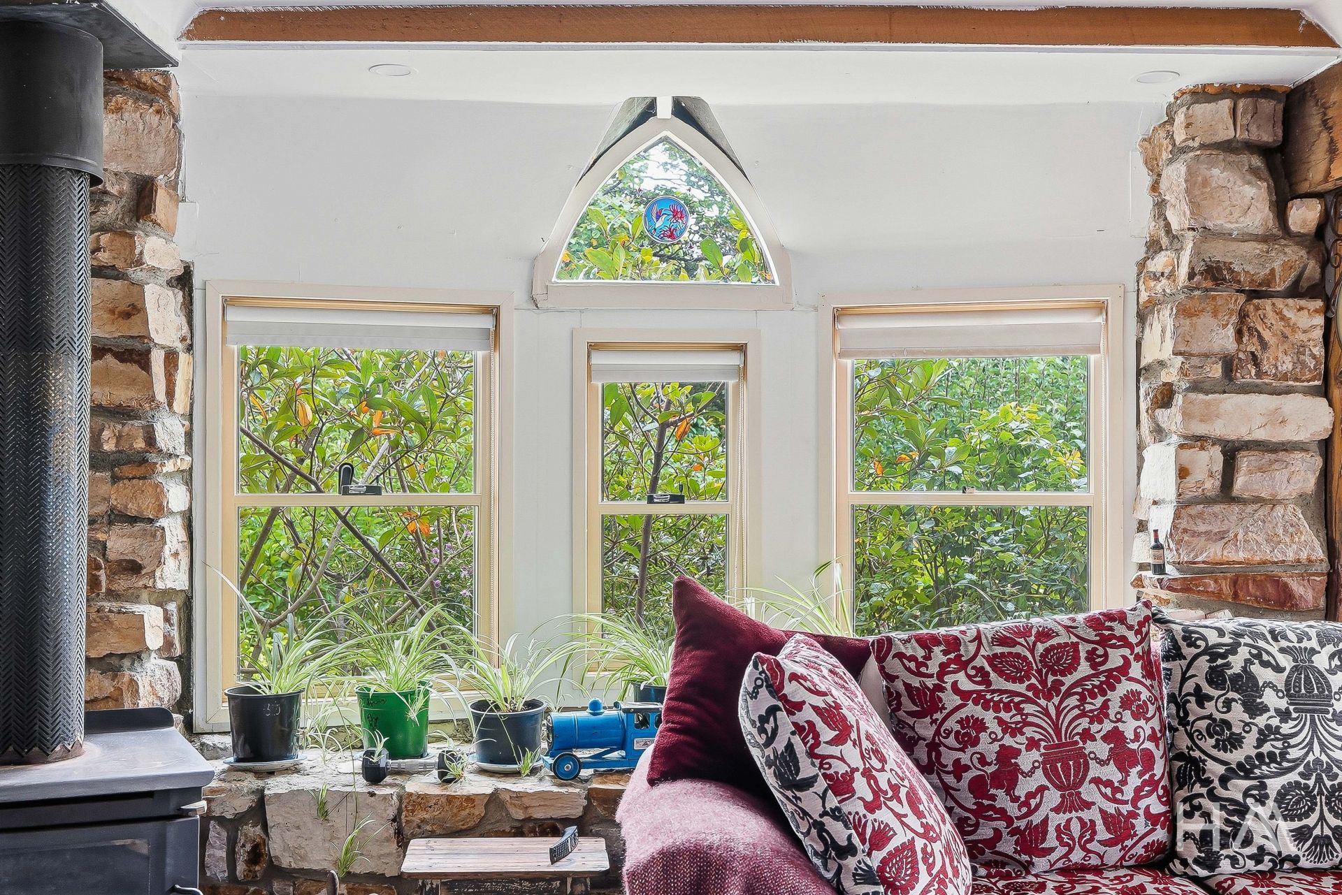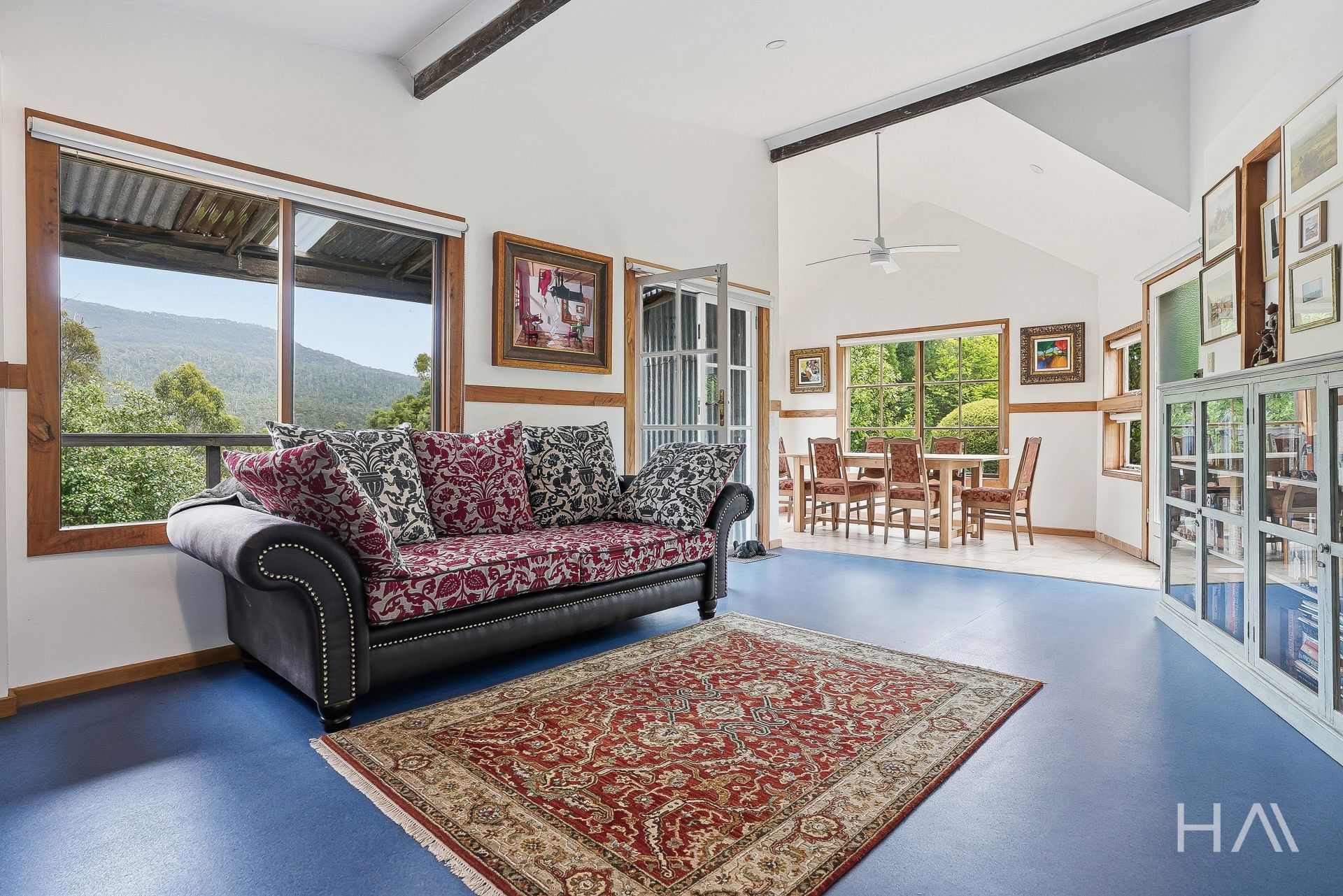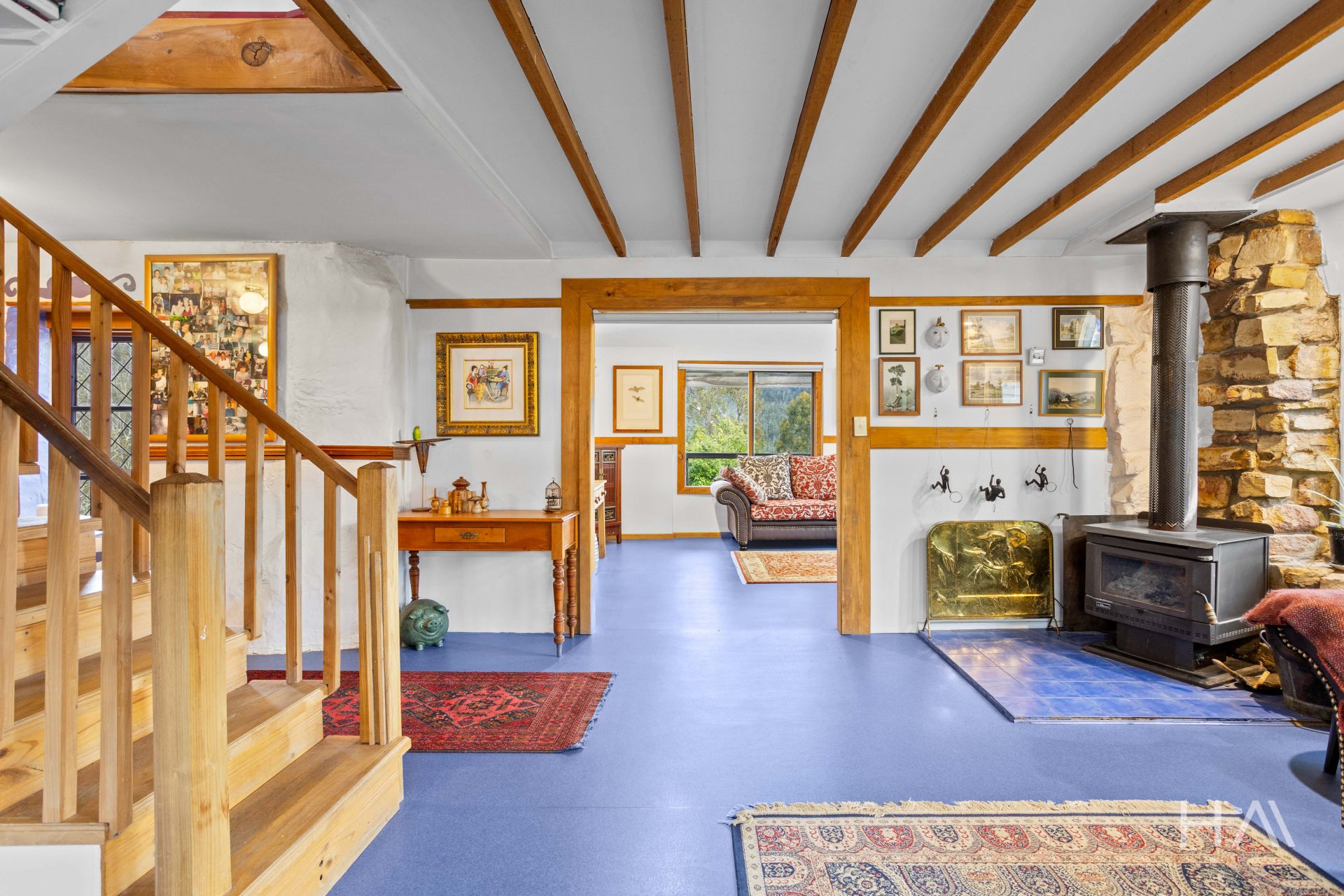 The home itself offers relaxed, rustic charm with light-filled open living, high ceilings and large windows that frame the surrounding landscape. A wood heater anchors the main living area, while the northern aspect fills the space with natural light throughout the day. The layout includes three bedrooms plus an additional living area that could easily serve as a home office or fourth bedroom.