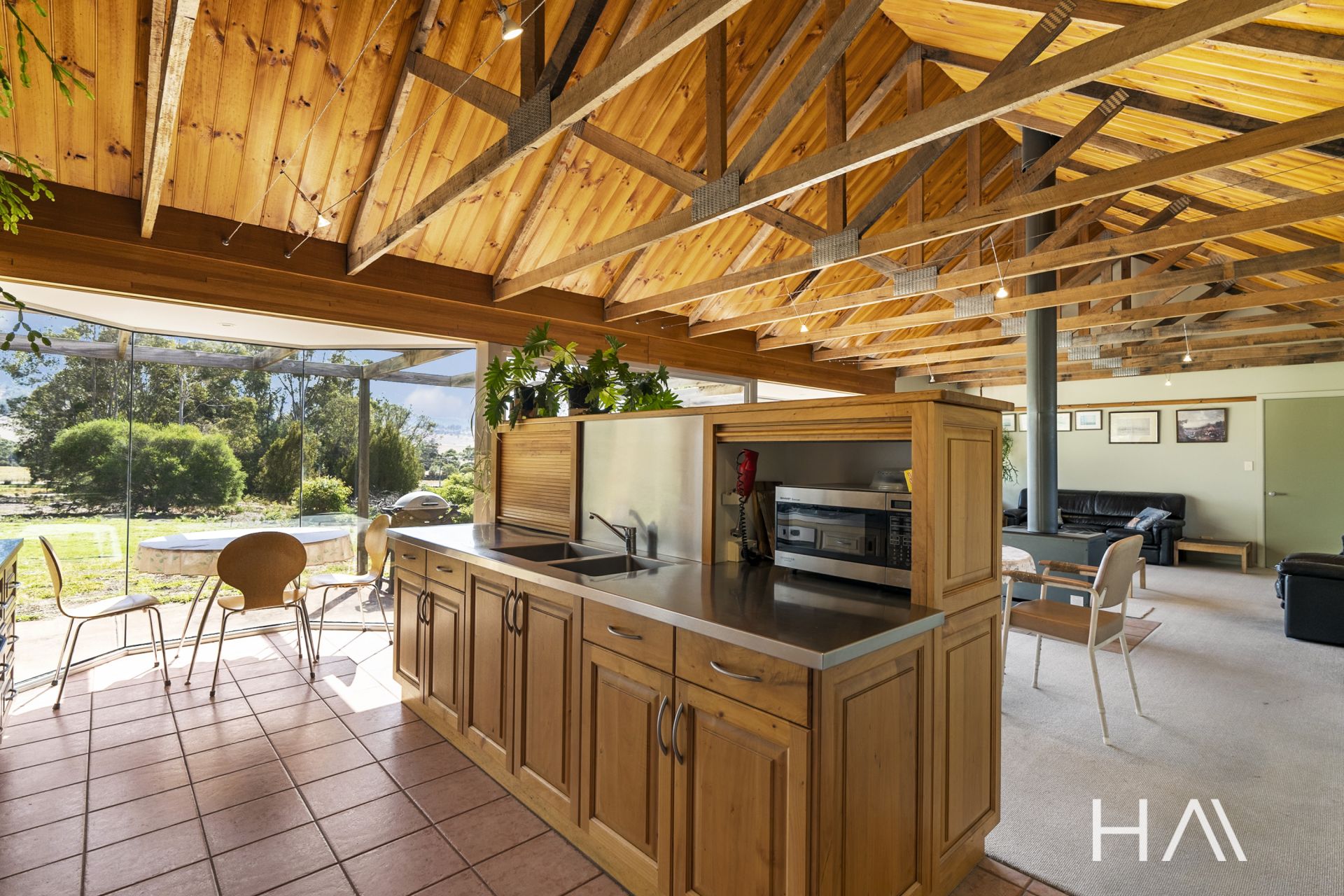 Spanning approximately 5.91 hectares of lush Tasmanian landscape, this estate offers an unparalleled blend of functionality, beauty, and sustainability. At its heart lies a meticulously designed residence featuring three spacious bedrooms, offering serene retreats for relaxation and rejuvenation. The home includes two elegantly appointed bathrooms and two additional toilets, crafted to cater to the modern family's needs with ease and sophistication.