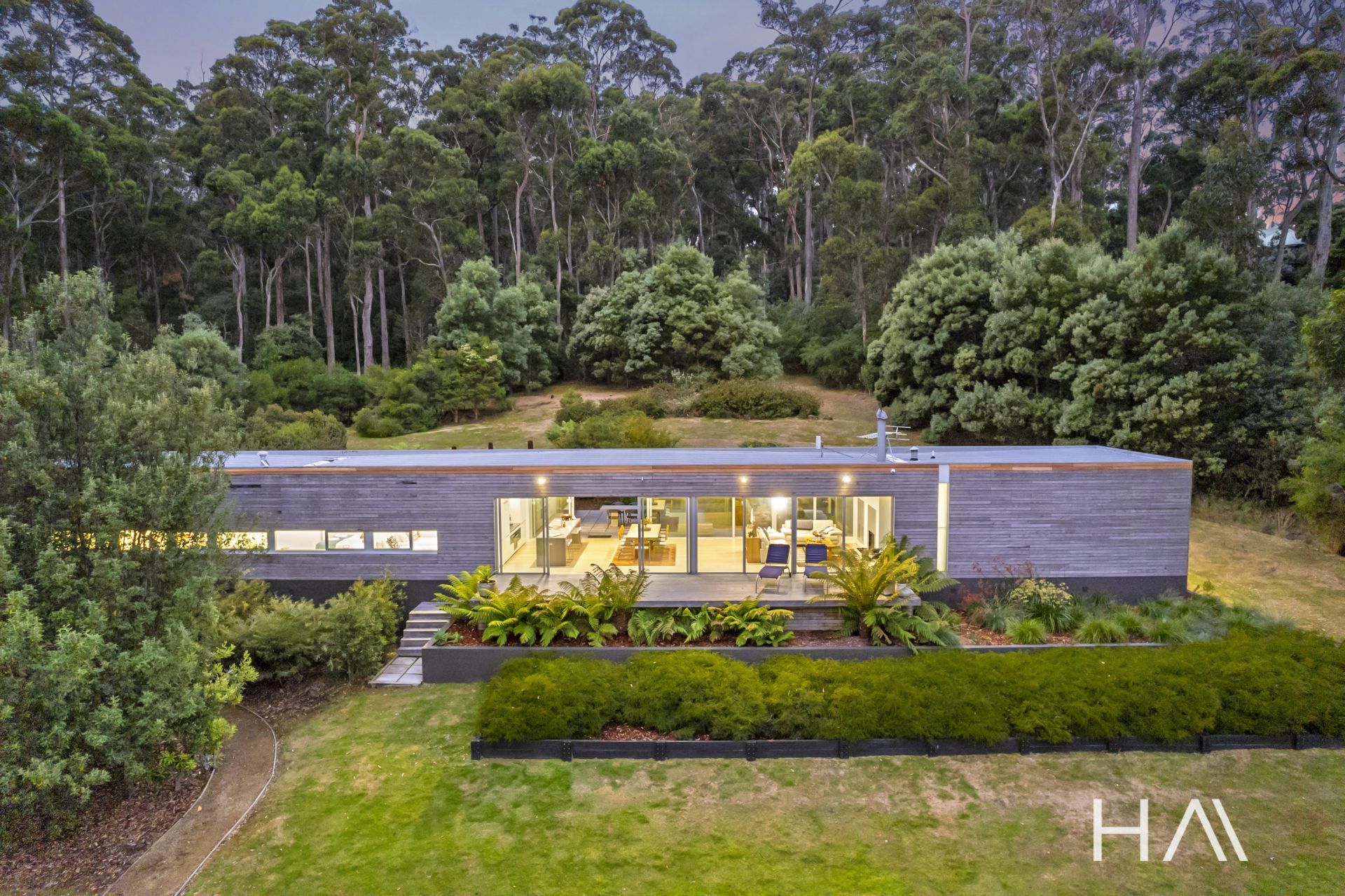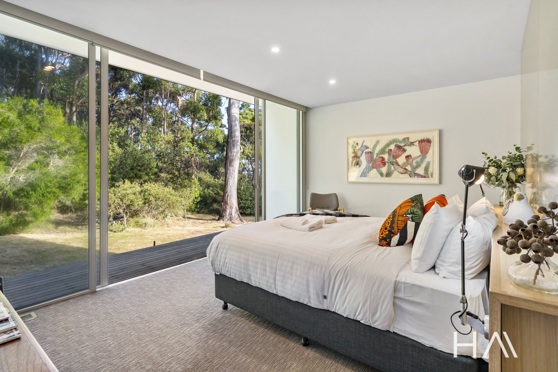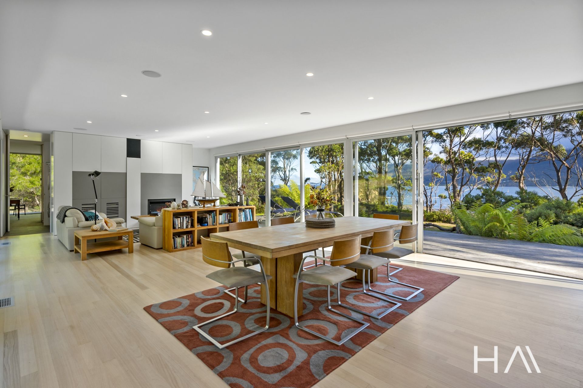 Stunning views across Pirates Bay and the iconic Tasman Peninsula coastline are one of many standout features of this unique luxury home. Situated on an expansive grassy clearing with a temperate rainforest backdrop, the house has long, low, simple lines, and sits parallel to the shore with a discrete path leading down a gentle slope to the water's edge. Sensitively designed with aged timber walls combined with the extensive use of glass, the home blends beautifully with its environment. The current owners have enjoyed this attractive property for a number of years and have shared it with others, having run it as a very successful, luxury holiday destination. They are now offering it for sale on a walk-in walk-out basis.