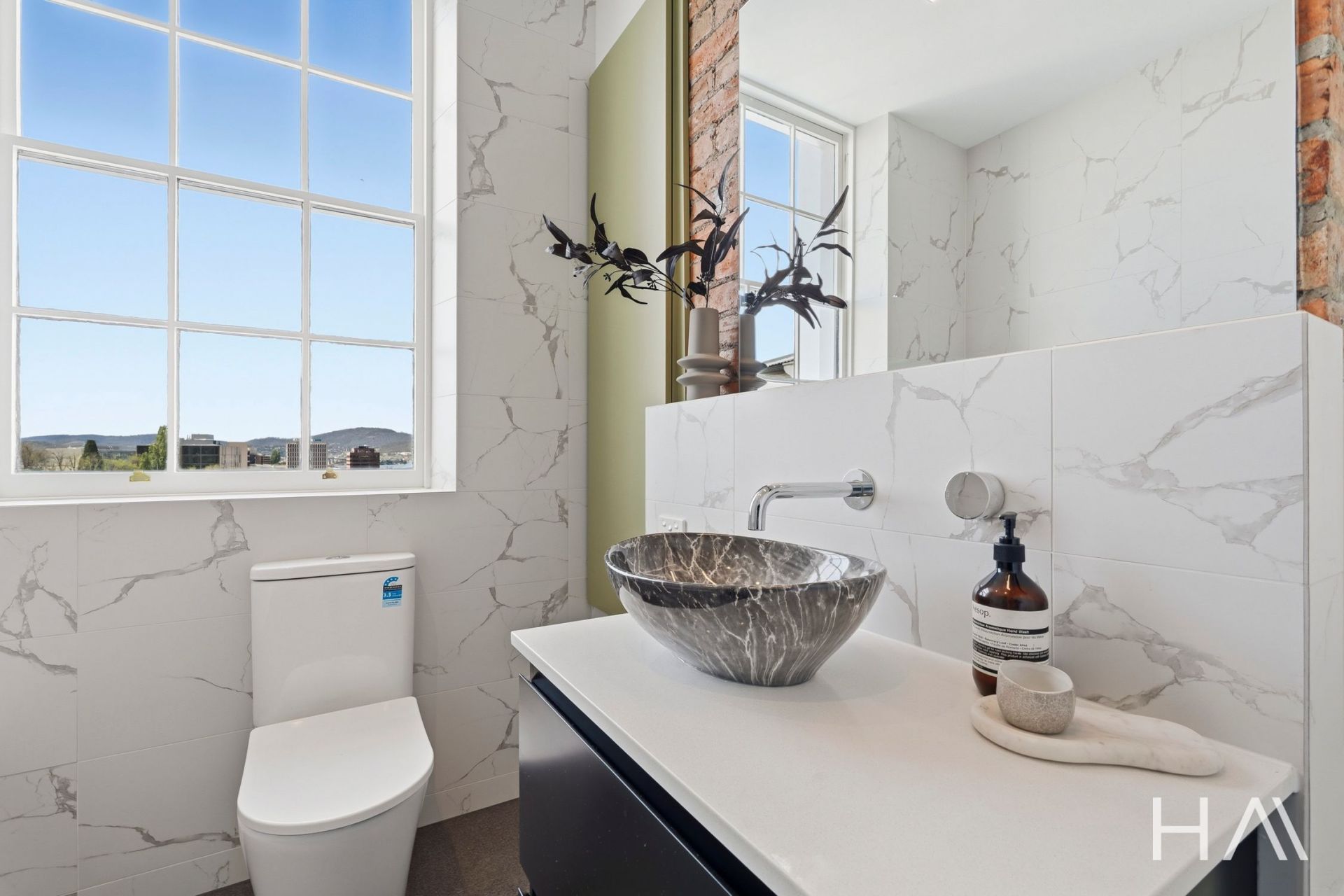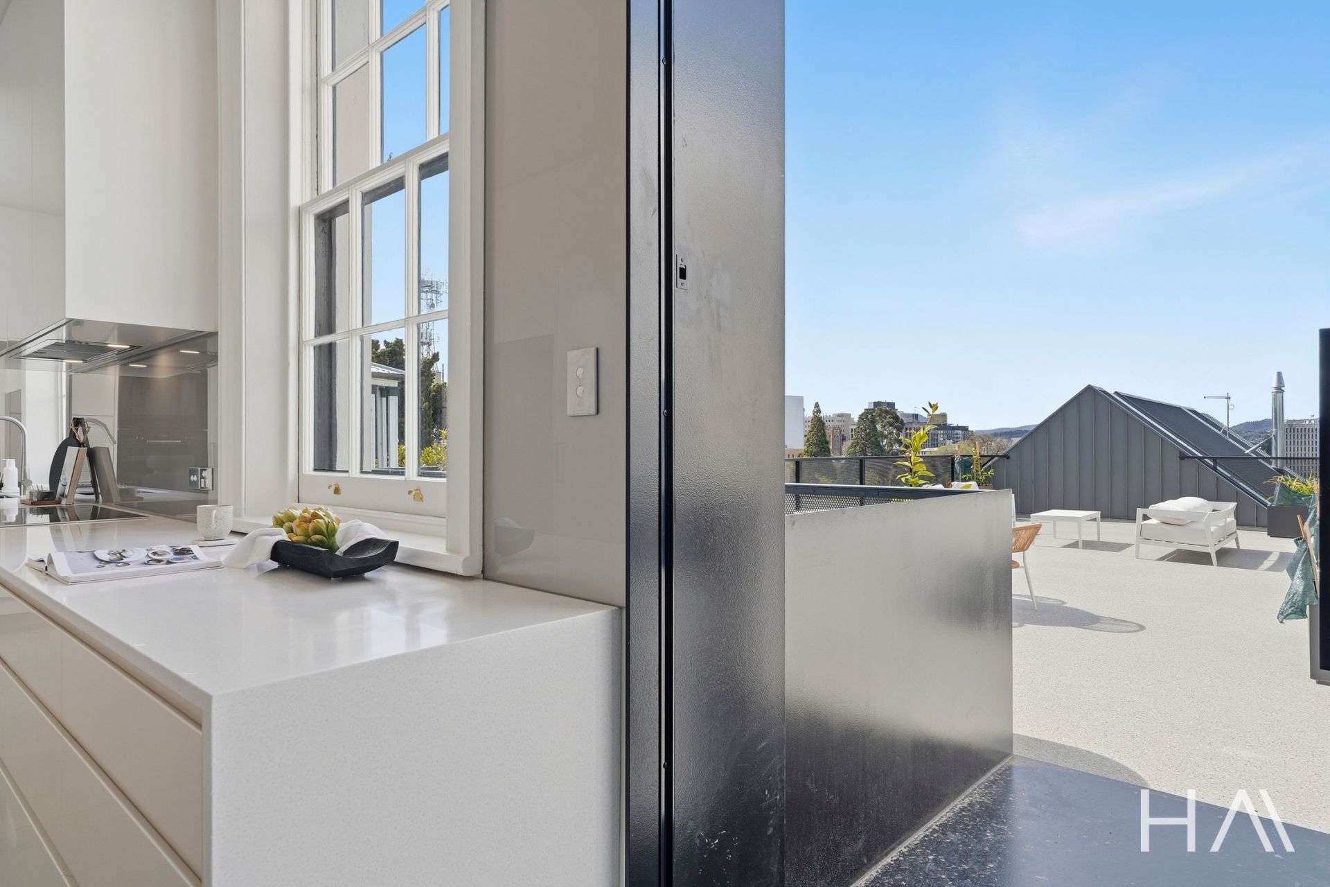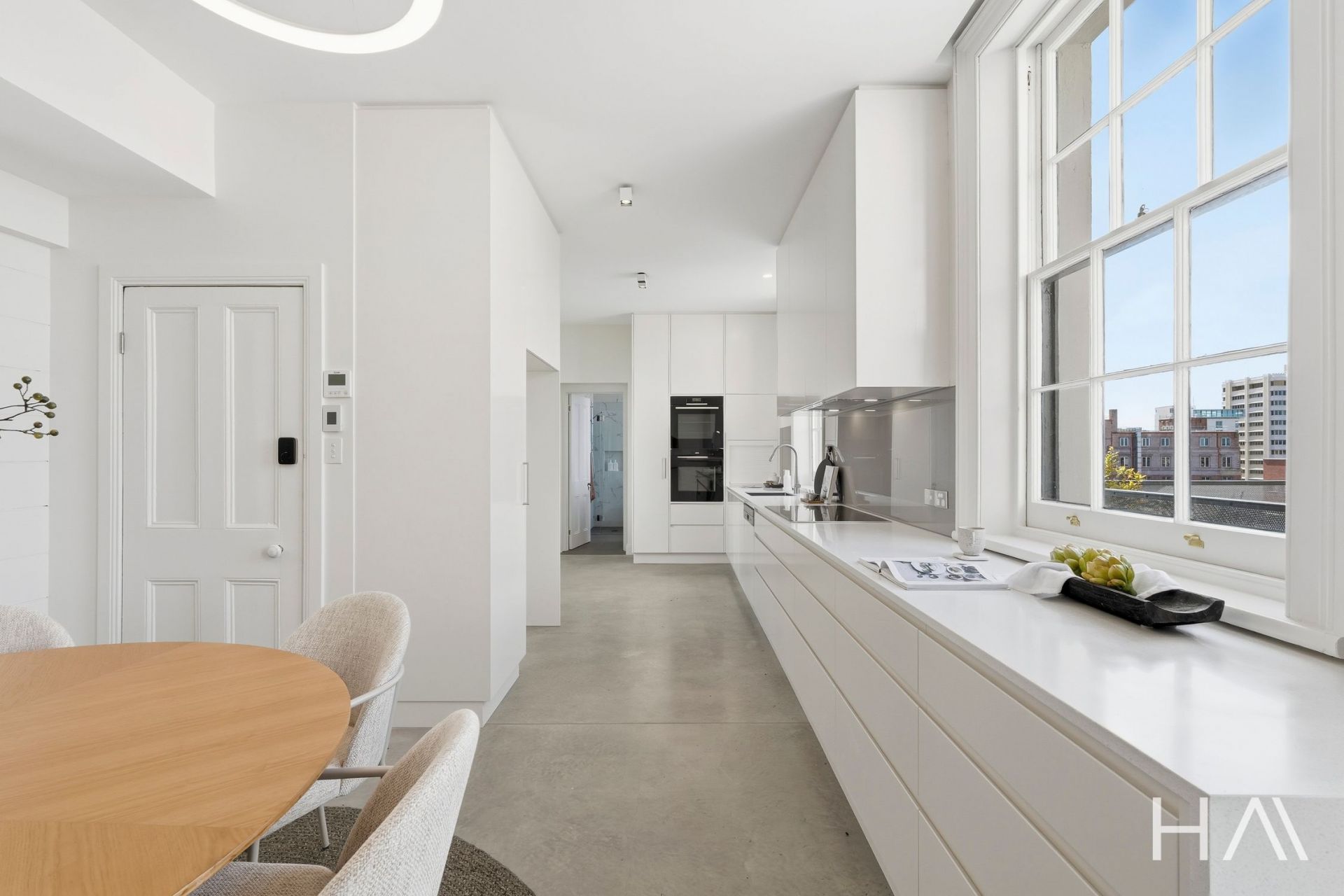 High ceilings, original detailing, and a timeless material palette sets a tone of quiet luxury, while expansive windows capture panoramic views across the Hobart CBD and harbour. Each space has been designed to celebrate light, texture, and proportion - from the generous open-plan living area to the beautifully appointed kitchen and private bedrooms, two with their own refined bathroom.