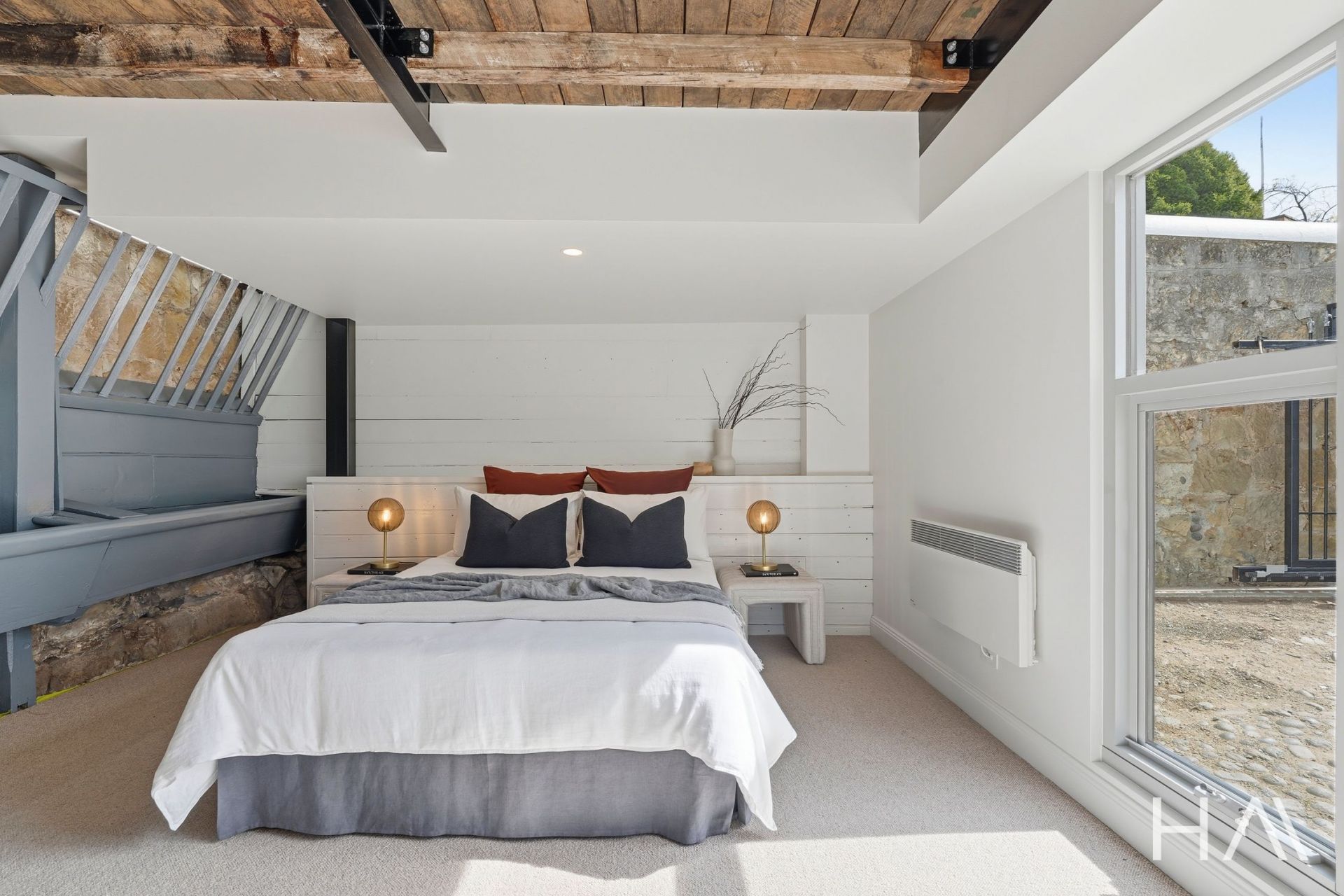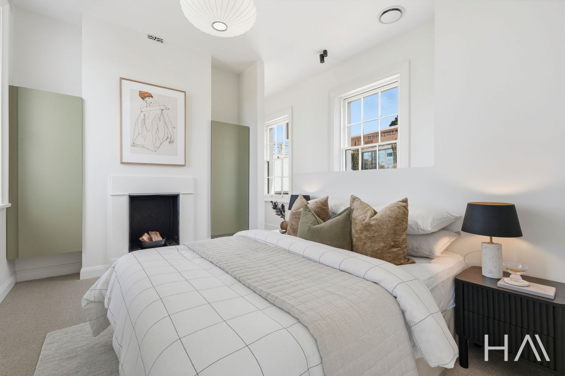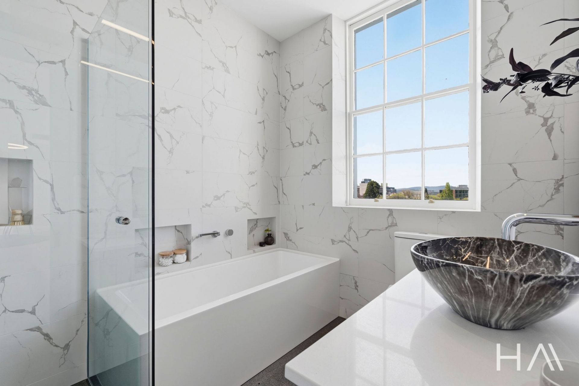 High ceilings, original detailing, and a timeless material palette sets a tone of quiet luxury, while expansive windows capture panoramic views across the Hobart CBD and harbour. Each space has been designed to celebrate light, texture, and proportion - from the generous open-plan living area to the beautifully appointed kitchen and private bedrooms, two with their own refined bathroom.