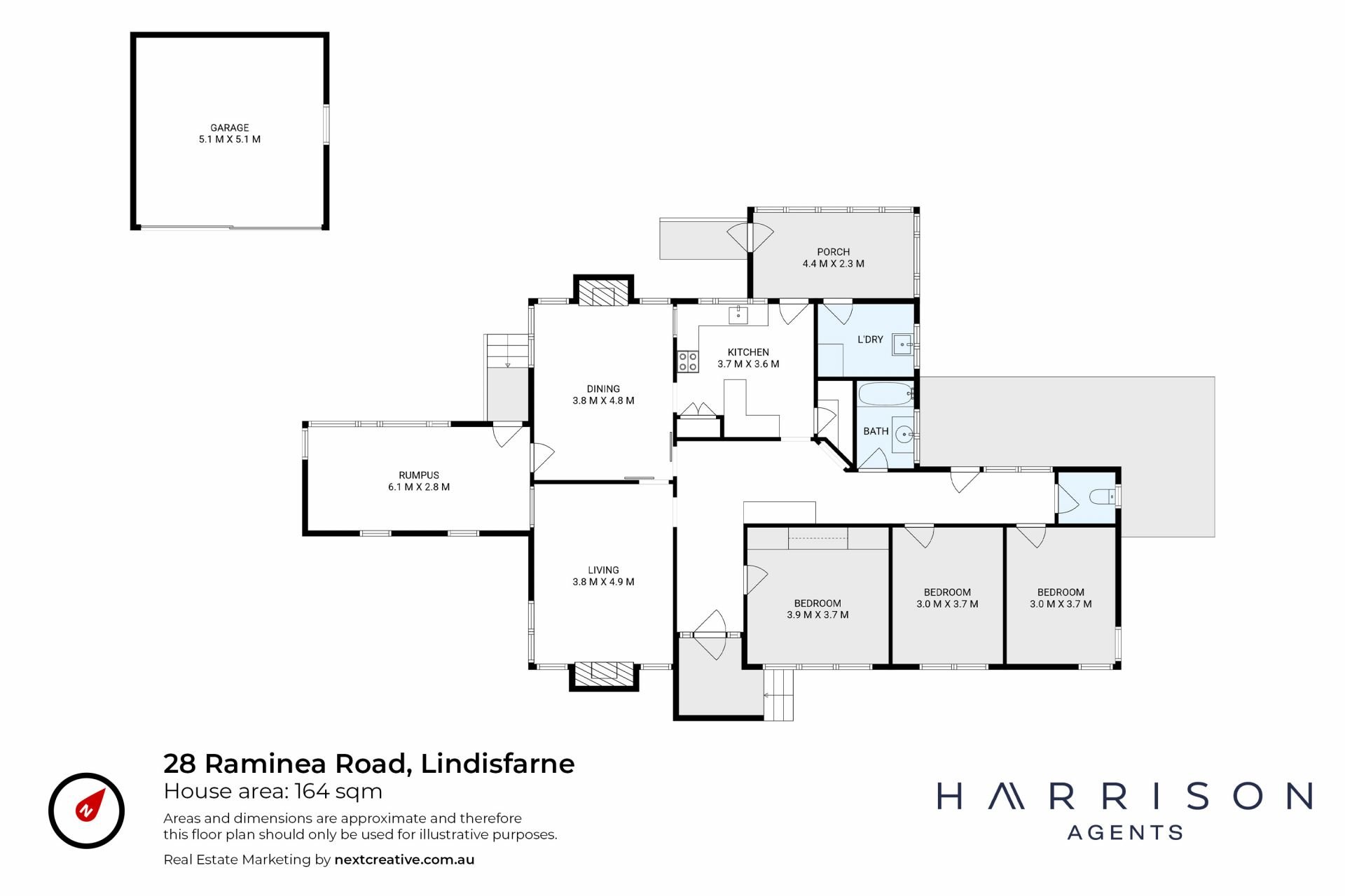 There are three generous bedrooms, with the main including built-in robes. A central bathroom, a standalone toilet, and a large laundry complete the layout.