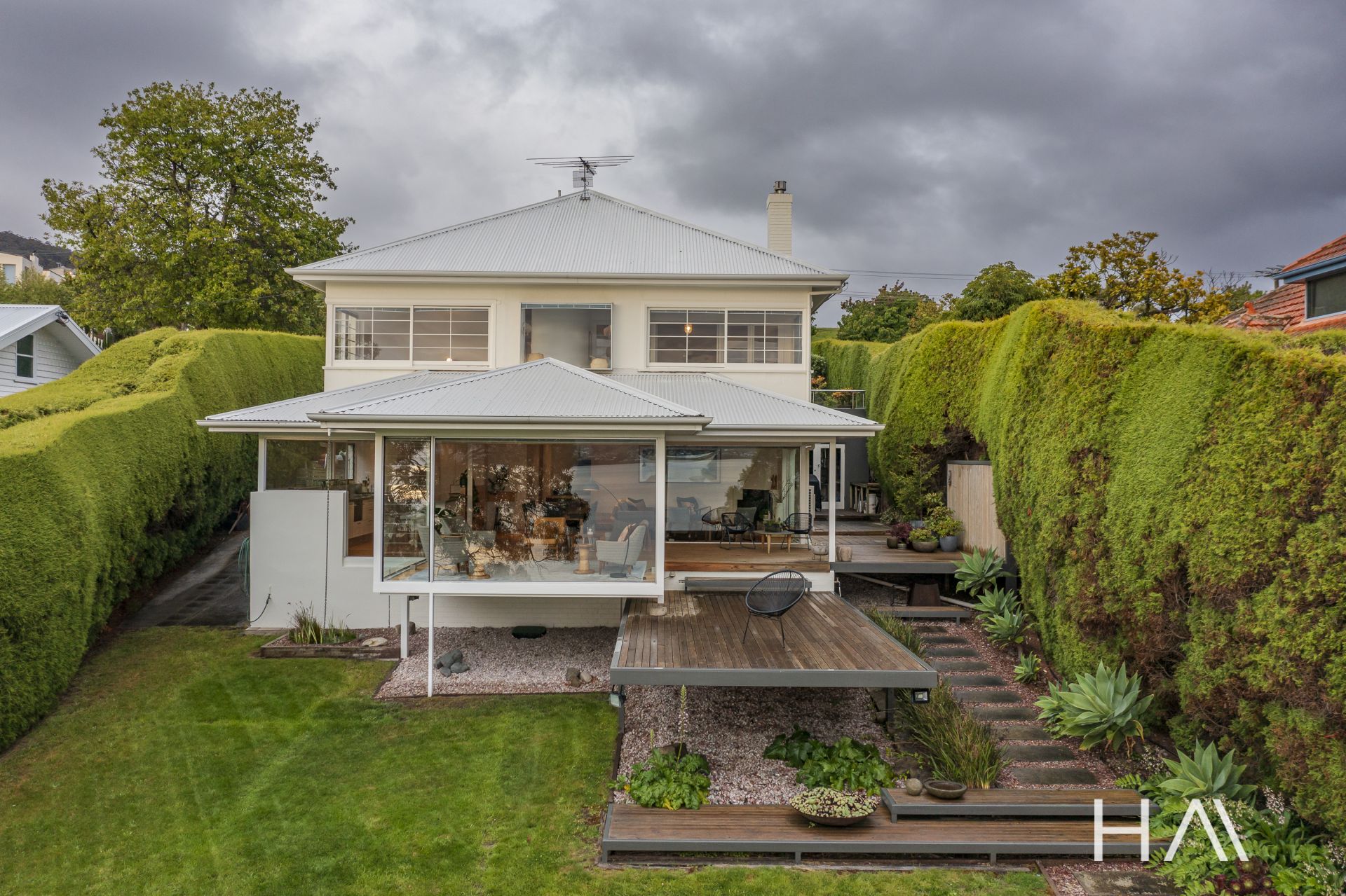 This solid brick house was designed and built in 1936 in the classic Art Deco-cum-P&O style reflecting the elegant, classic era of the ocean liner. While the home has undergone a vast renovation since the 1930s, the fabulous features of streamlined curved walls, simple skirting boards and rounded, geometrically decorated fireplaces have been retained. Wide steps descend from the three car off-street parking area to the front door, edged by an easy-care sculptured garden. On the upper level of the home is a comfortable sitting room with French doors opening to a covered patio that captures the afternoon sun, while a second set of French doors lead to a sunroom and beautiful water views beyond. The primary bedroom shares these tranquil views and with its easterly aspect, greets the sun as it rises over the Eastern Shore. An expansive en suite with quality fixtures and fittings is behind the bedroom, while a walk through wardrobe leads to a second bathroom and bedroom.