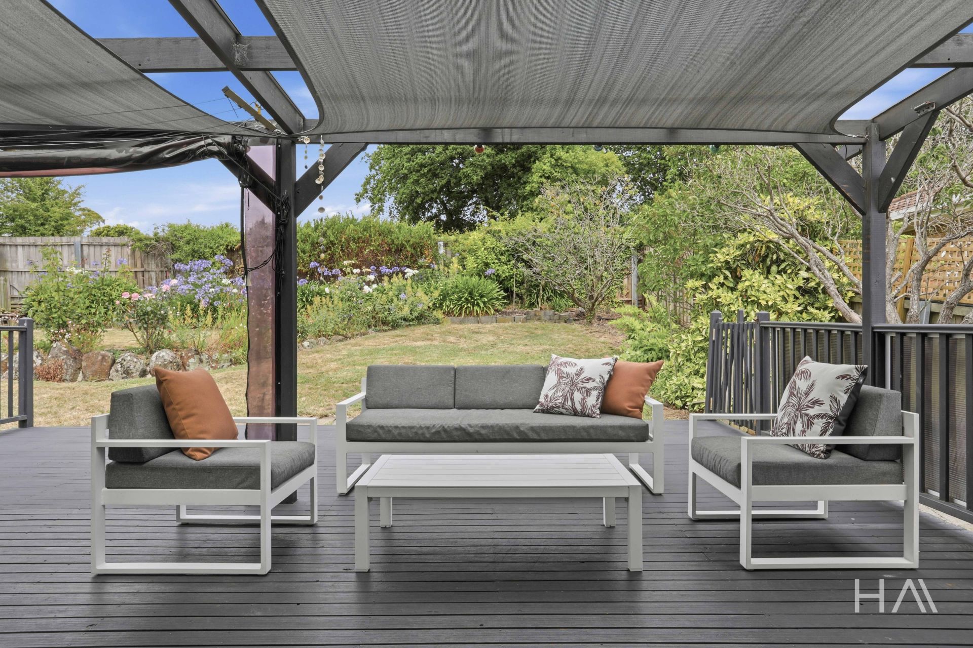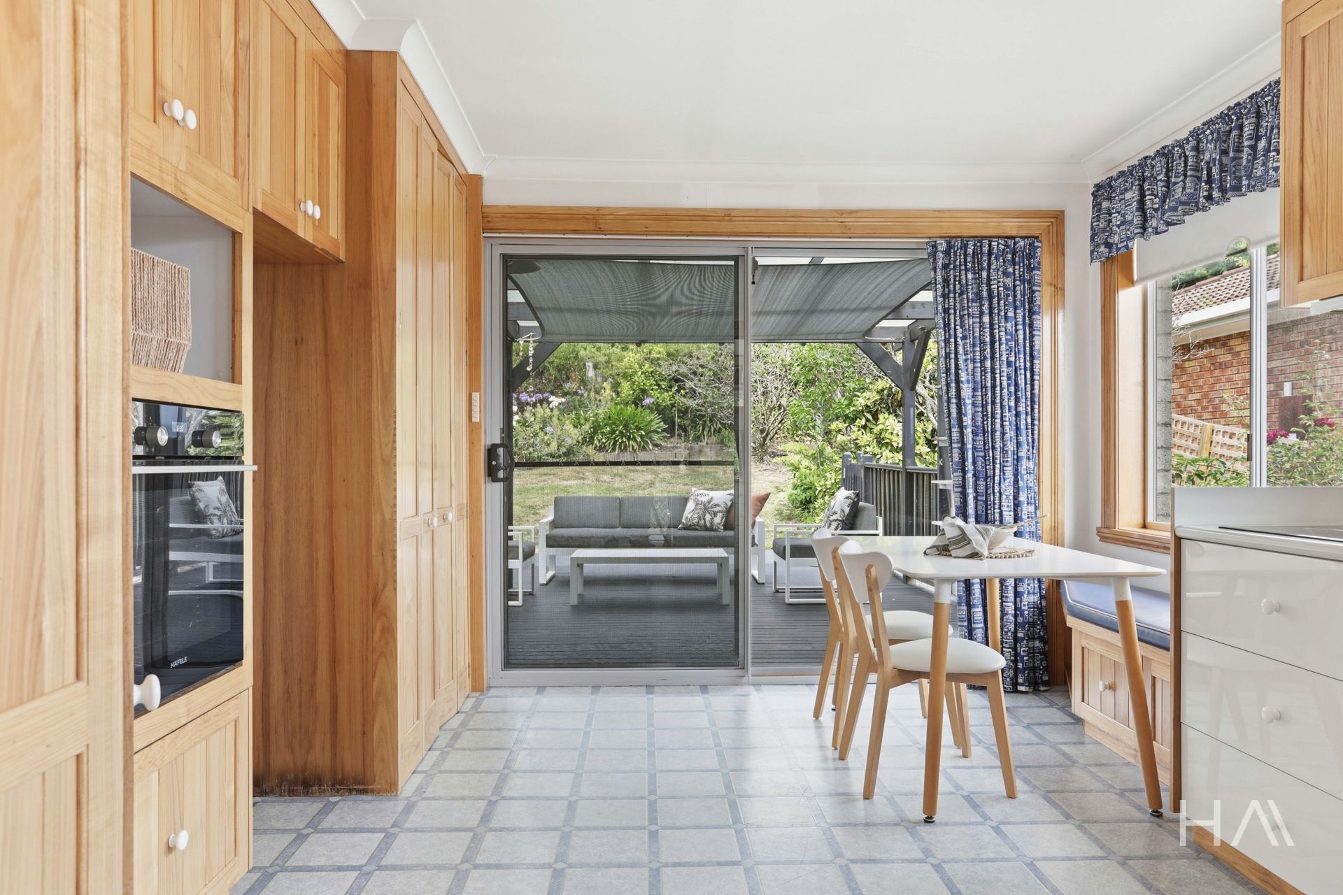 Sliding doors lead out to a covered outdoor area, ideal for year-round use, overlooking well-manicured gardens that provide a private and tranquil backdrop.