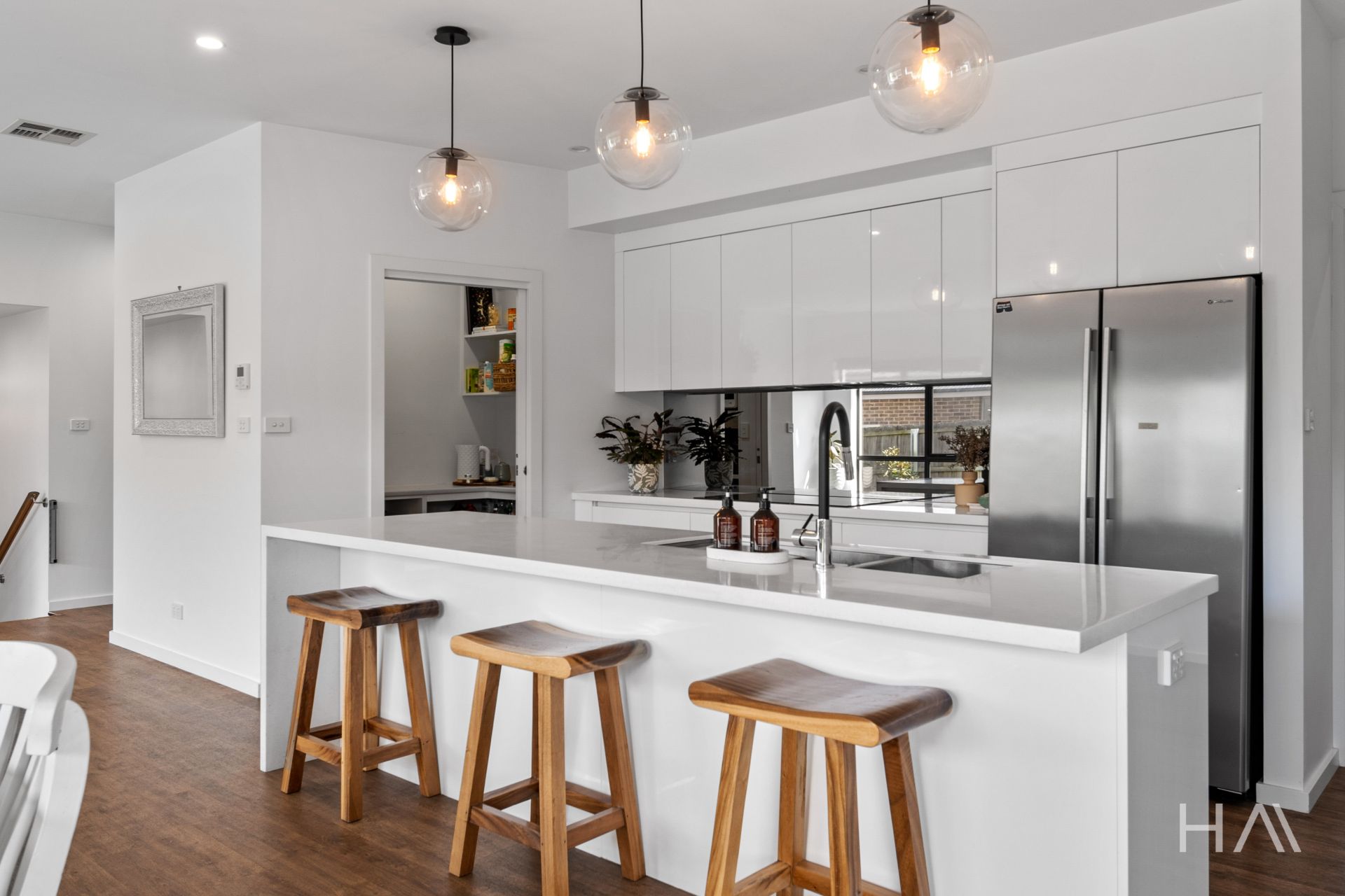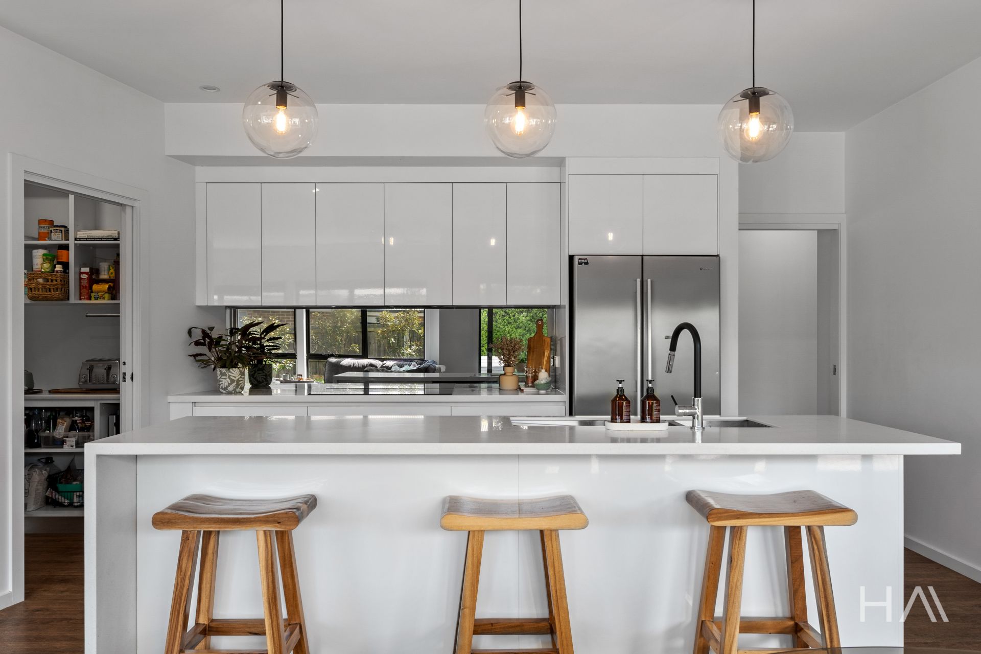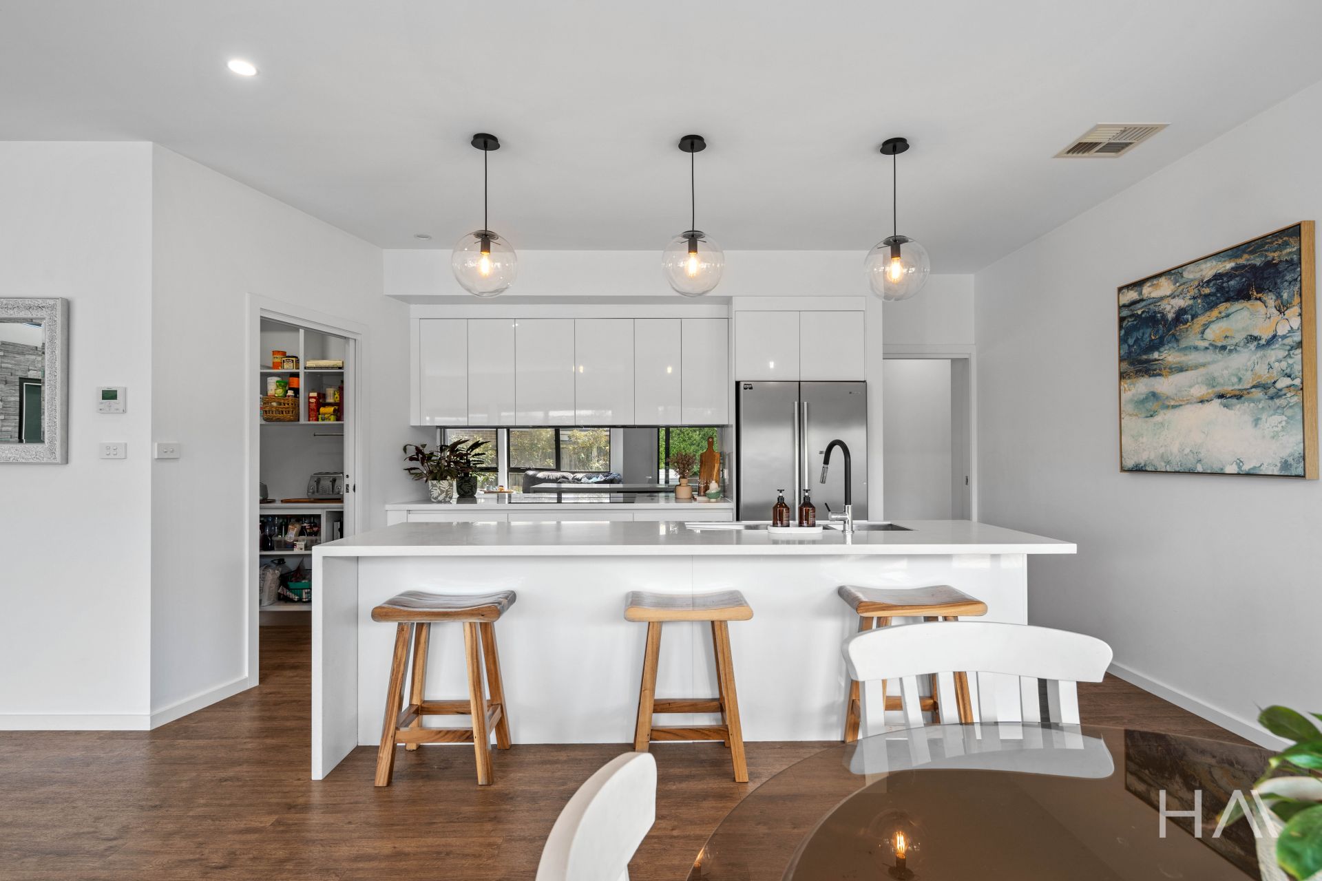 At the heart of this home lies the meticulously designed kitchen, which seamlessly flows into the inviting open-plan living and dining areas. Its sleek, modern aesthetic is enhanced by a spacious butler's pantry, ensuring that every meal whether an intimate dinner or a grand family feast can be crafted with ease. Double-glazed windows and sliding doors bathe the space in natural light while offering excellent insulation and noise reduction, thereby enhancing your comfort throughout the year. Additionally, ducted heating and cooling throughout the home ensure a perfectly climate-controlled environment for year-round comfort.