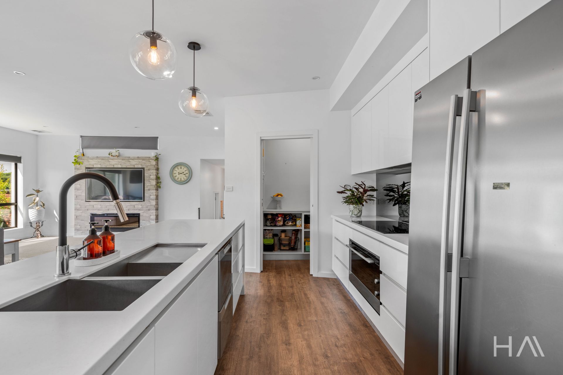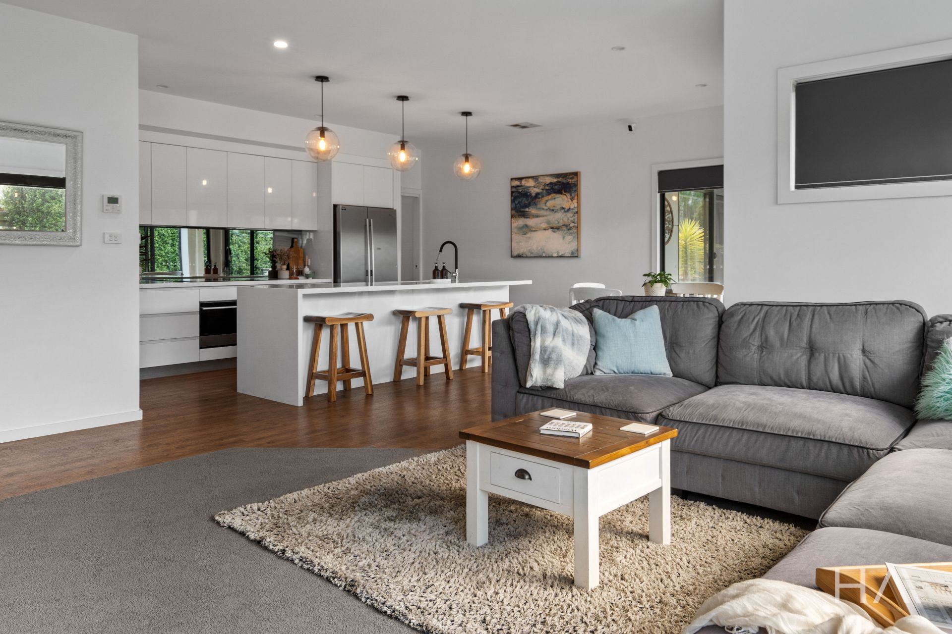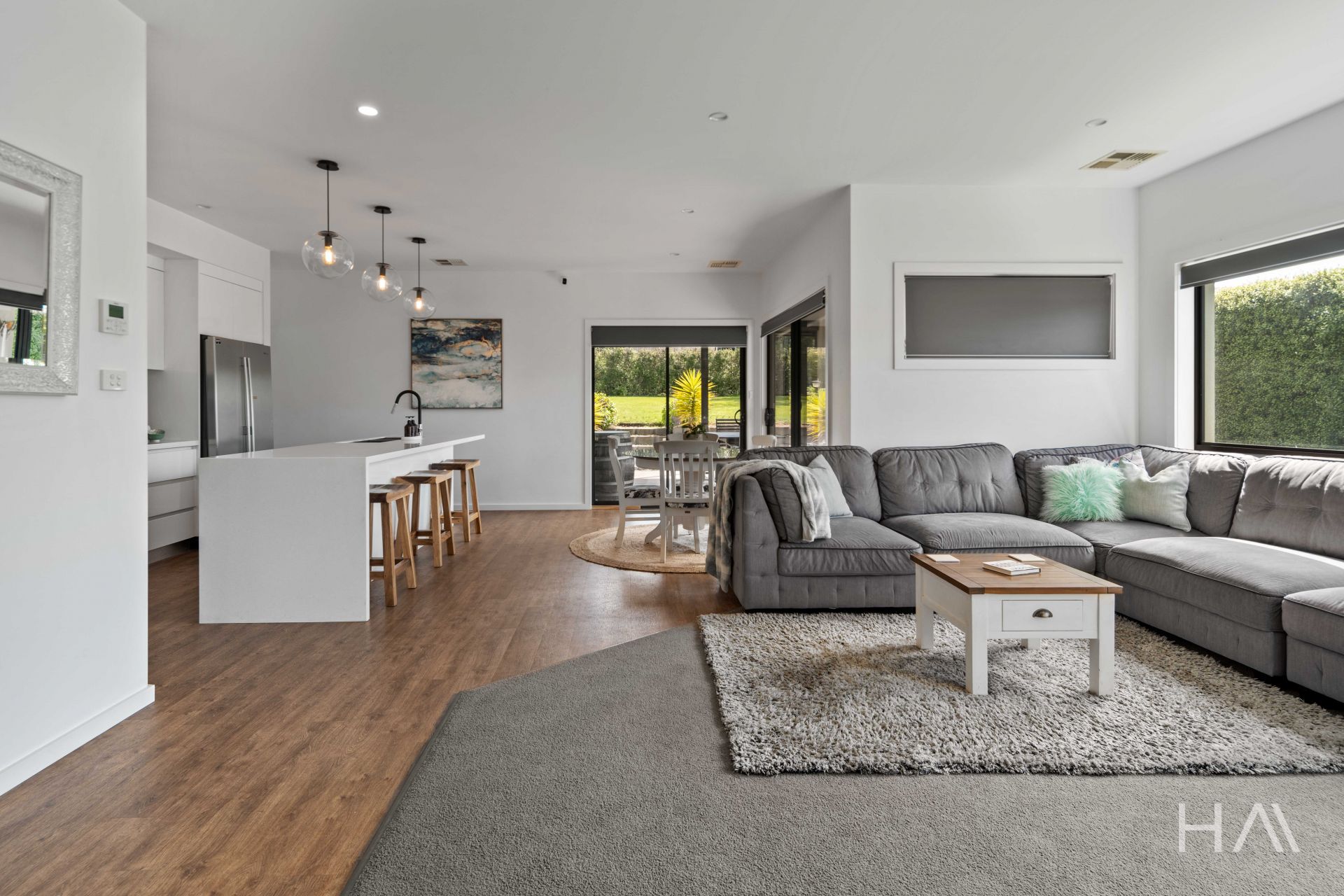 At the heart of this home lies the meticulously designed kitchen, which seamlessly flows into the inviting open-plan living and dining areas. Its sleek, modern aesthetic is enhanced by a spacious butler's pantry, ensuring that every meal whether an intimate dinner or a grand family feast can be crafted with ease. Double-glazed windows and sliding doors bathe the space in natural light while offering excellent insulation and noise reduction, thereby enhancing your comfort throughout the year. Additionally, ducted heating and cooling throughout the home ensure a perfectly climate-controlled environment for year-round comfort.