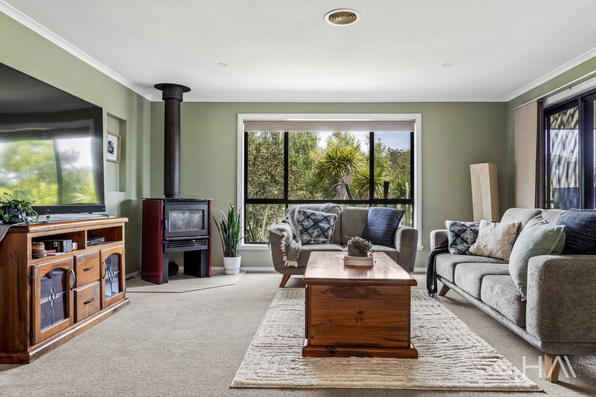 As you step inside, you're greeted by a bright, open-plan kitchen, living, and dining area that seamlessly flows together, providing an inviting space for daily family life. A separate, second living area with a cozy wood heater and heat transfer kit offers a versatile, comfortable spot for larger families to unwind or entertain.