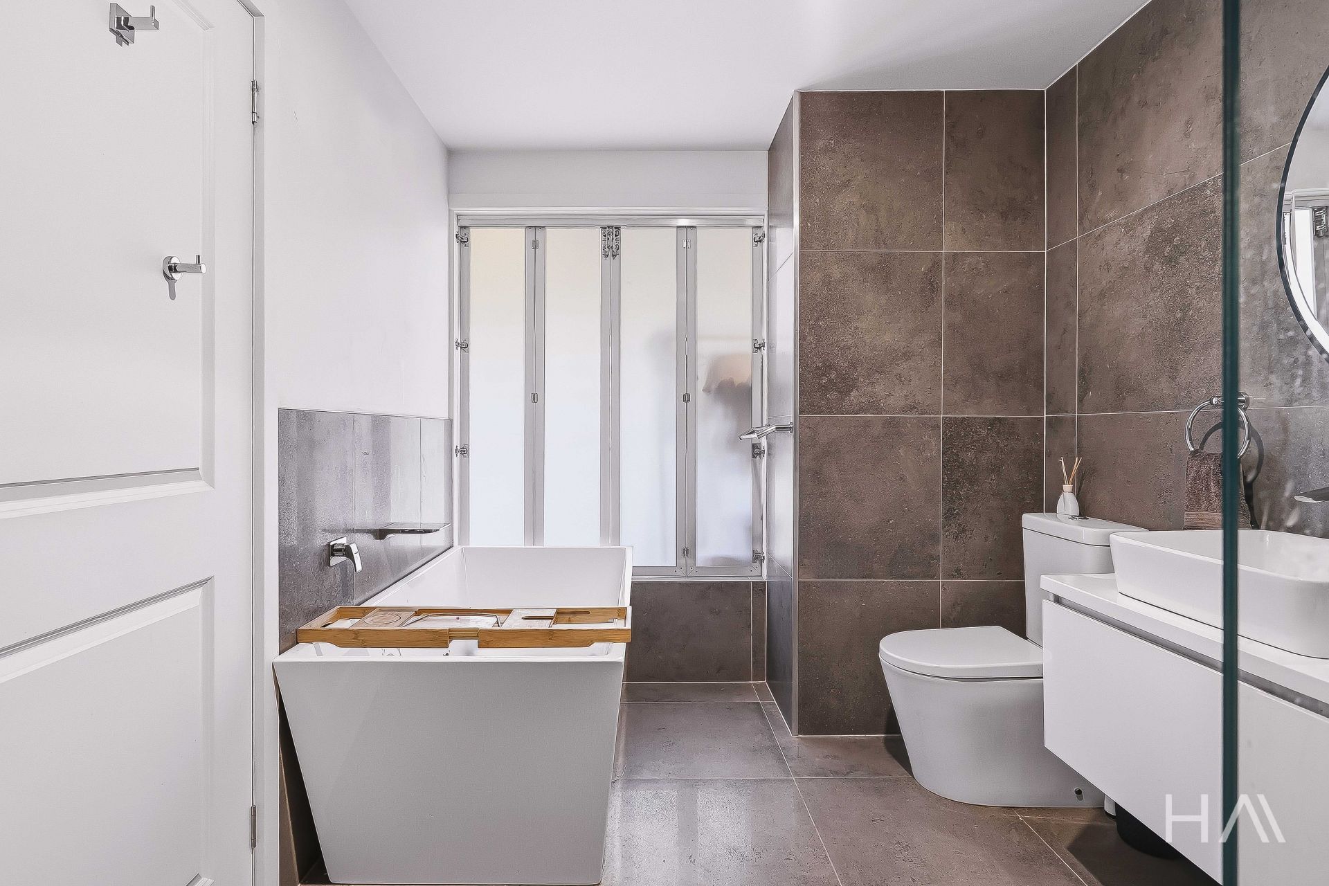 Upstairs, a timber staircase leads to two generous bedrooms and bathrooms. The master suite is light-filled and spacious, featuring a private balcony overlooking the Elphinwood green, a large walk-in robe, and a unique ensuite complete with shower, vanity, toilet, and a corner spa with a bi-fold window opening into the bedroom. The second bedroom is equally well proportioned, offering built-in storage and an additional sitting area-perfect for guests or a home office. The main bathroom is located nearby and includes a shower, vanity, and toilet.