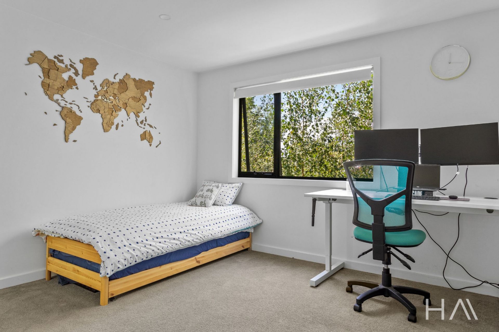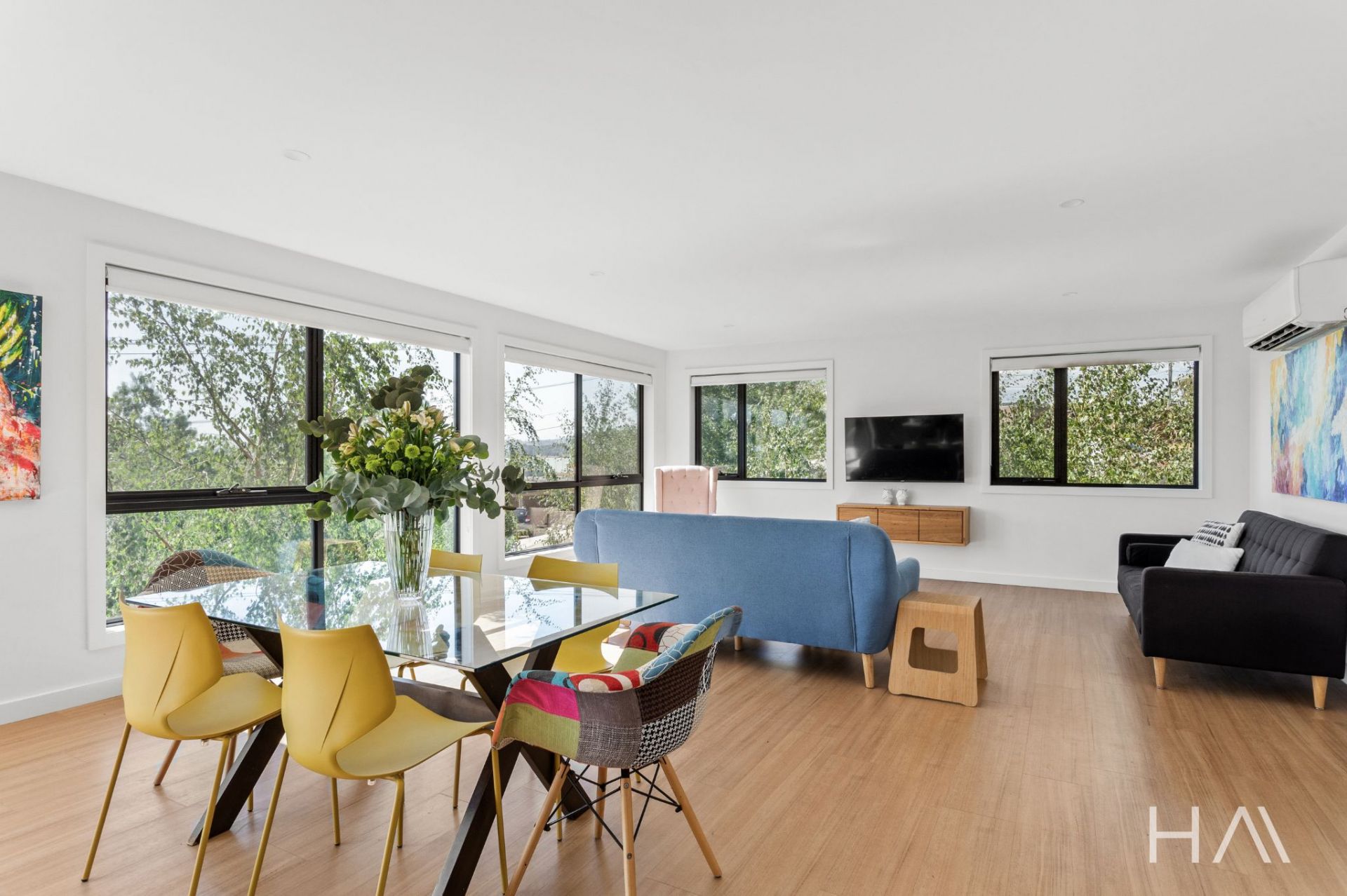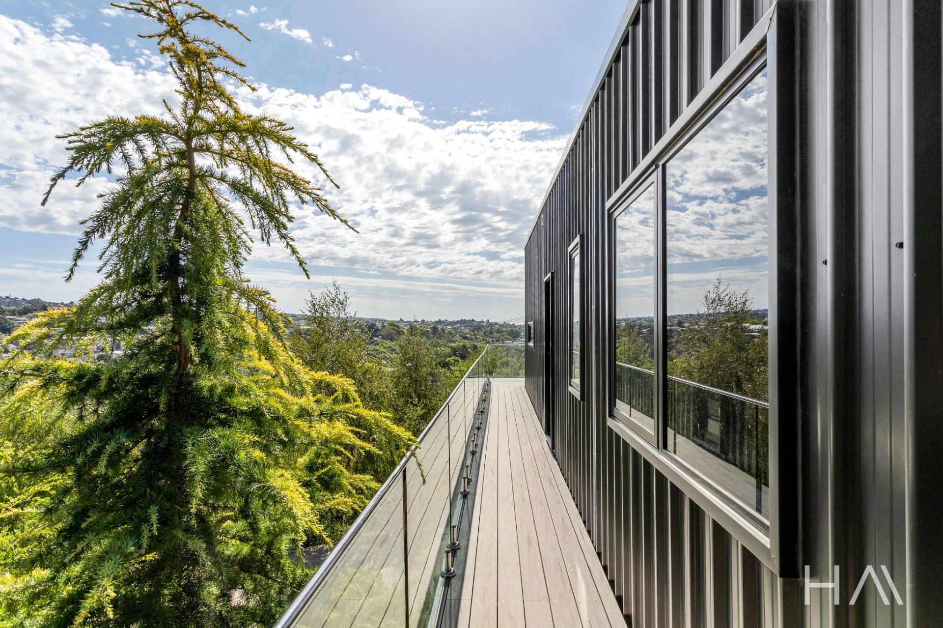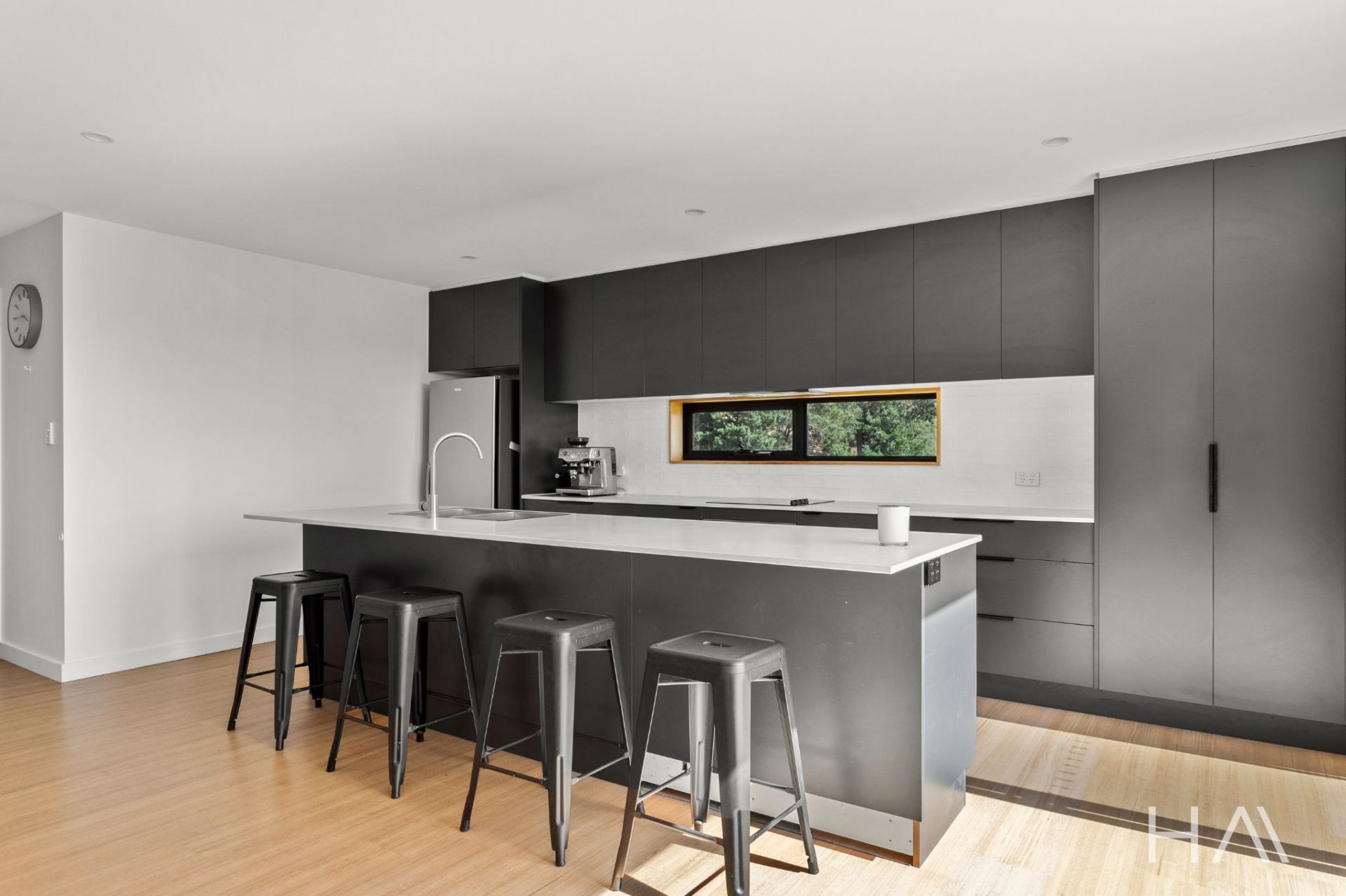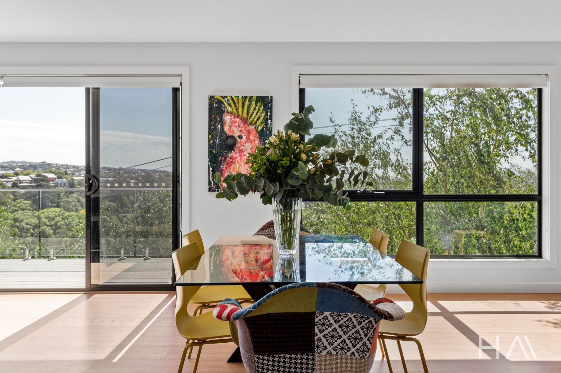 Inside, the home has been designed around light, space and outlook. The main living zone sits at the front of the home, where full-height glazing draws in the northern sun and makes the most of the views. The kitchen is contemporary and practical, featuring stone benchtops, quality appliances and excellent storage, and connects seamlessly with the living and dining area. Sliding doors open onto the northern deck, finished with glass balustrading to keep the views uninterrupted, an ideal space for everyday living or entertaining.