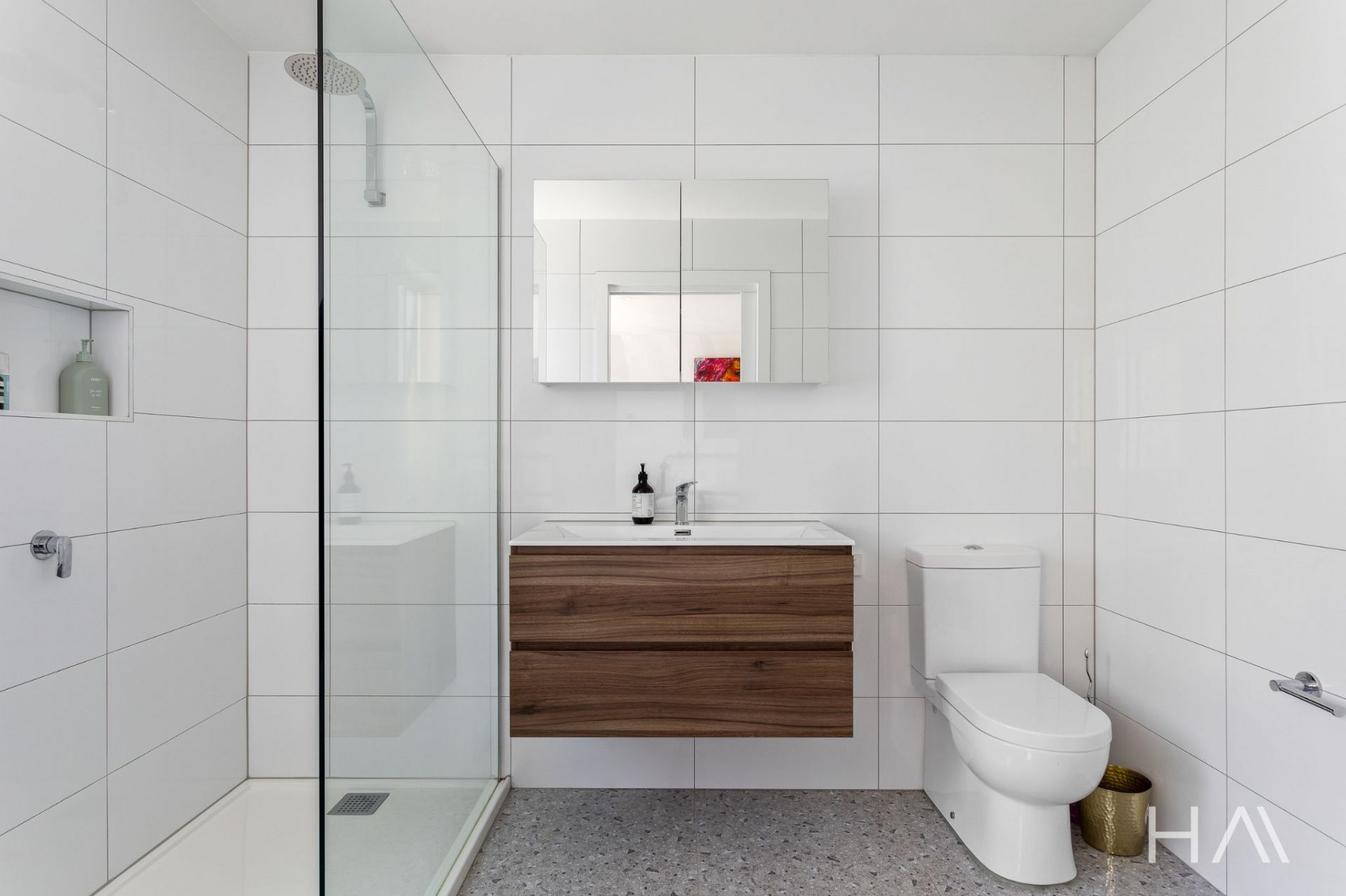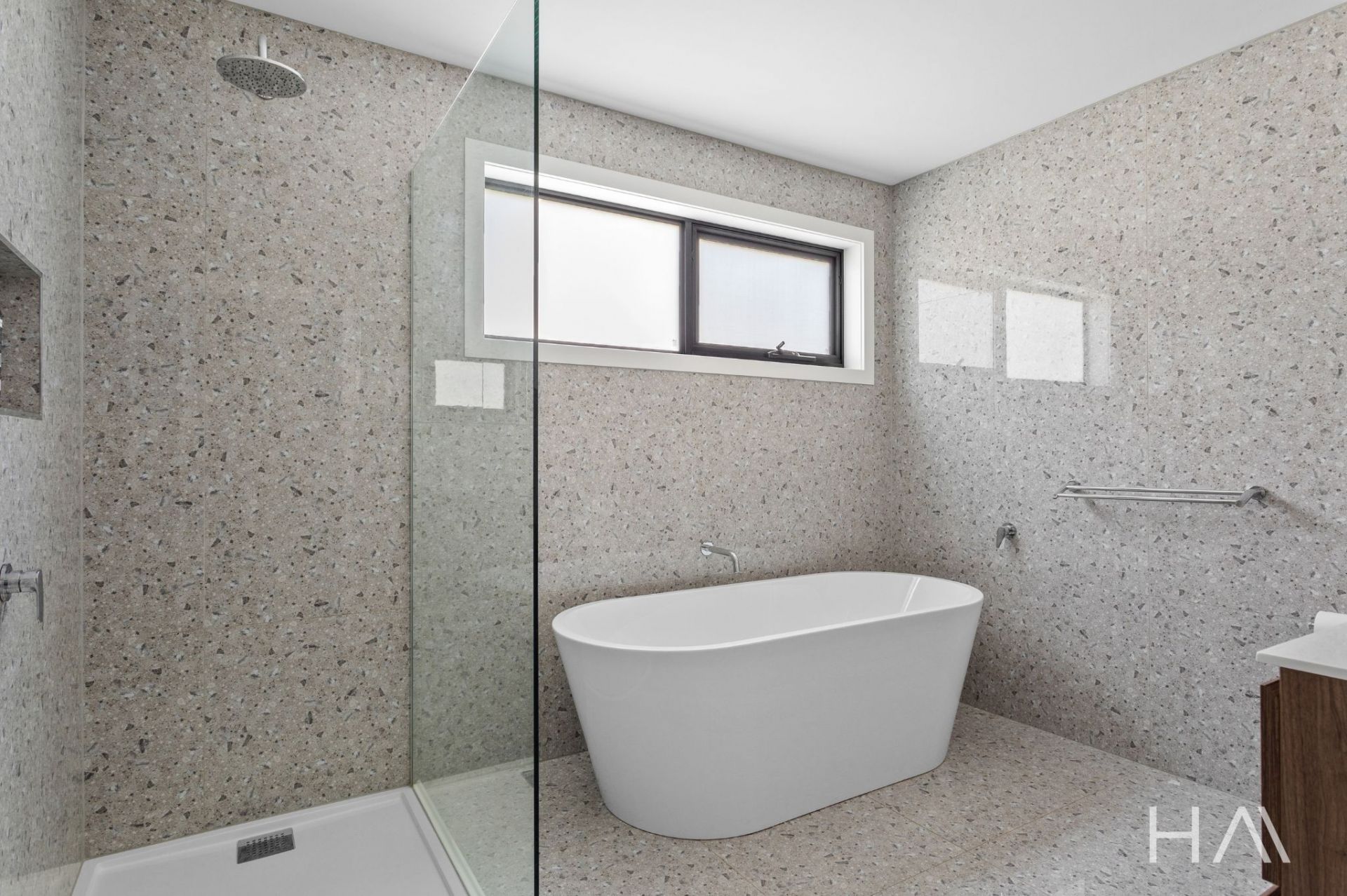 The main bathroom is beautifully finished with floor-to-ceiling tiles, quality fittings, a freestanding bath, and a rainfall shower.