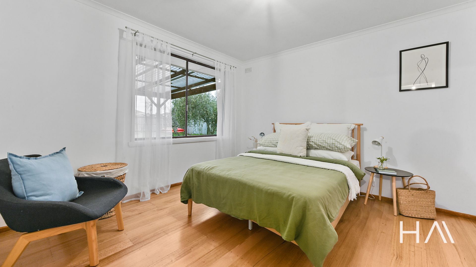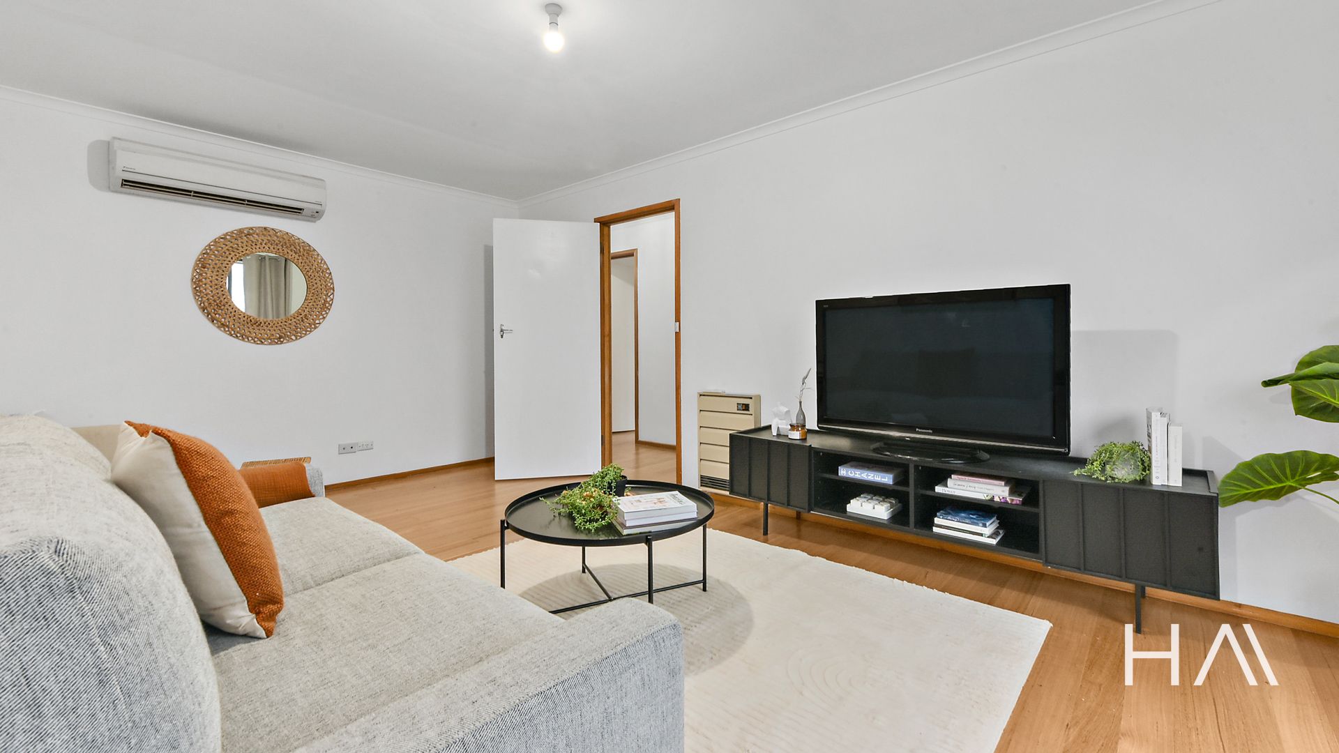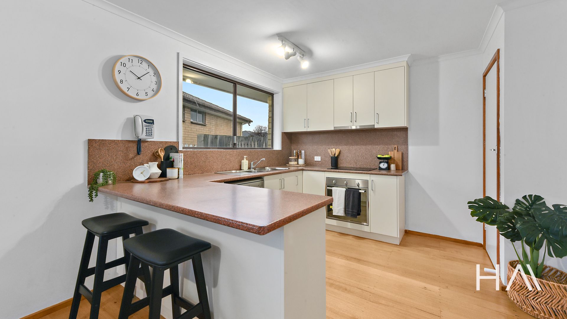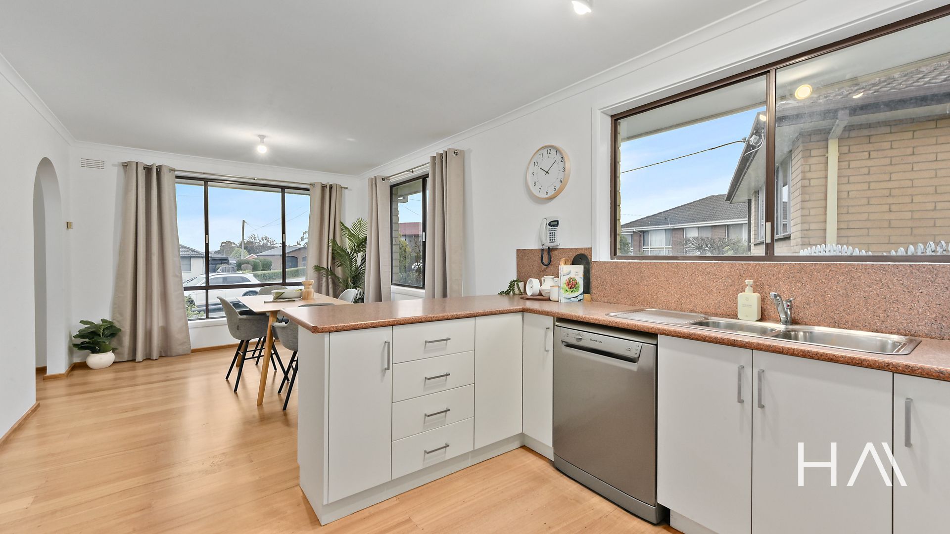 The master bedroom has built-in robes, and the bathroom includes a bath with a separate toilet. There's also a separate laundry with external access. The kitchen has a breakfast bar and flows into the dining space, while the living area is bright, spacious, and filled with natural light. Floorboards run throughout the home, giving it a warm and easy-care feel.