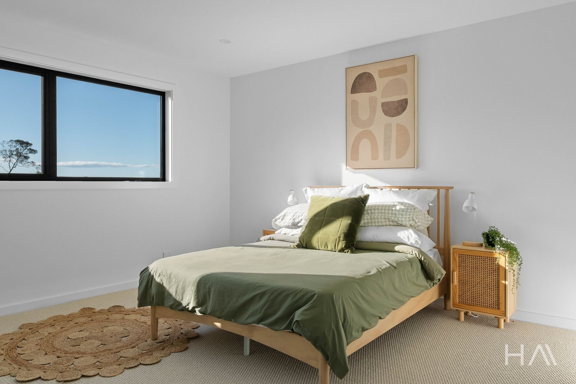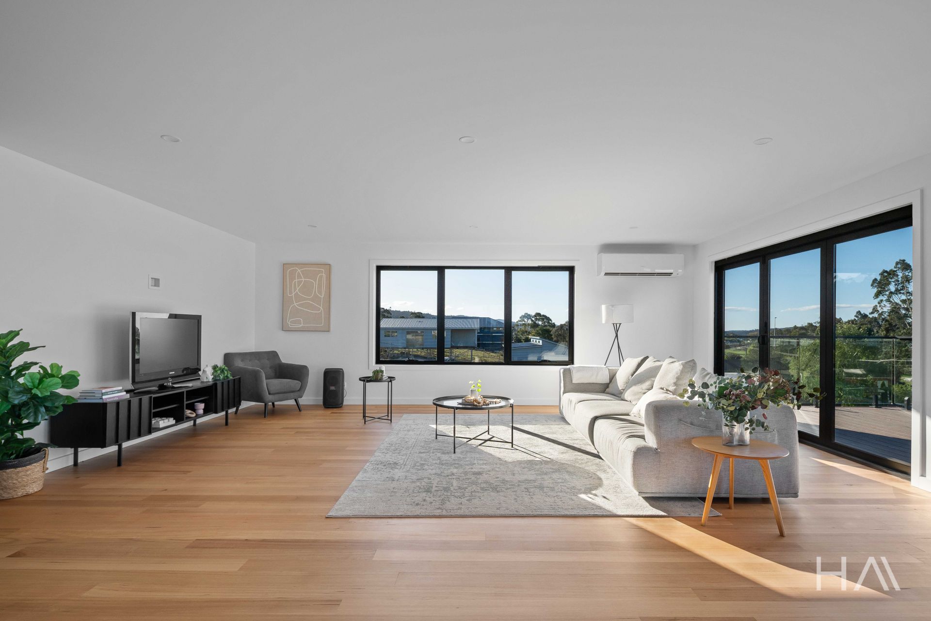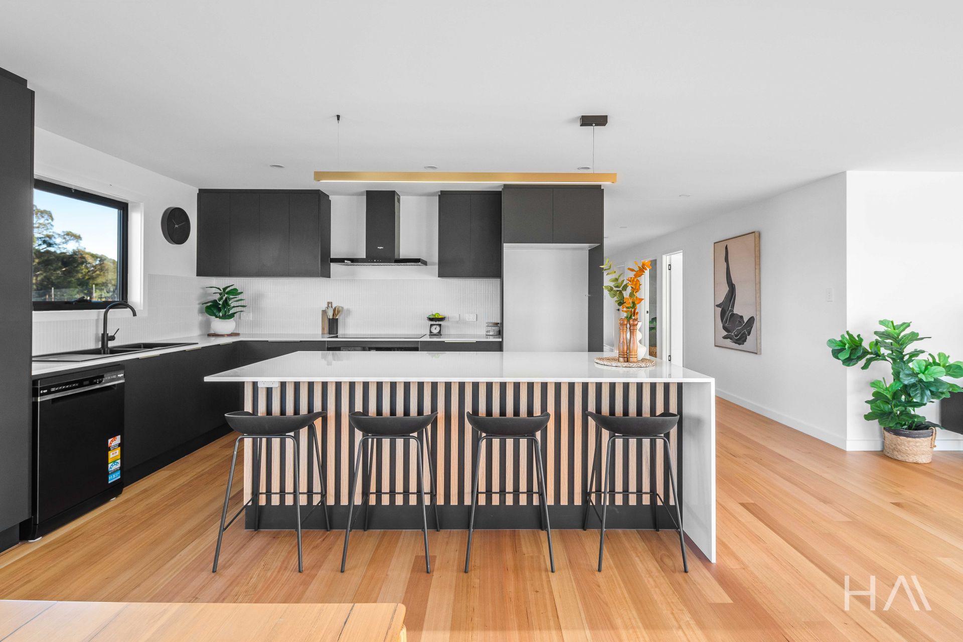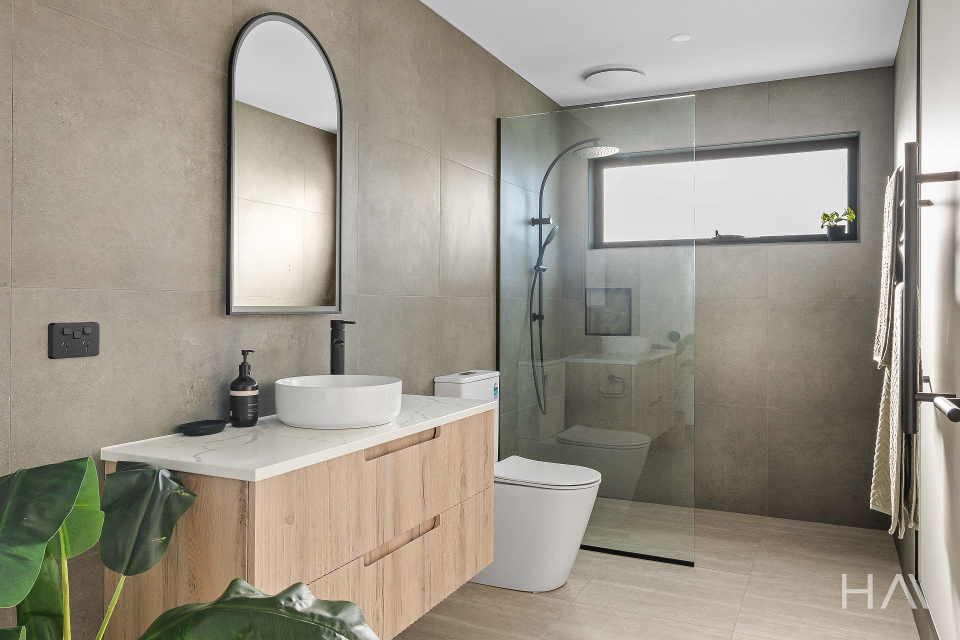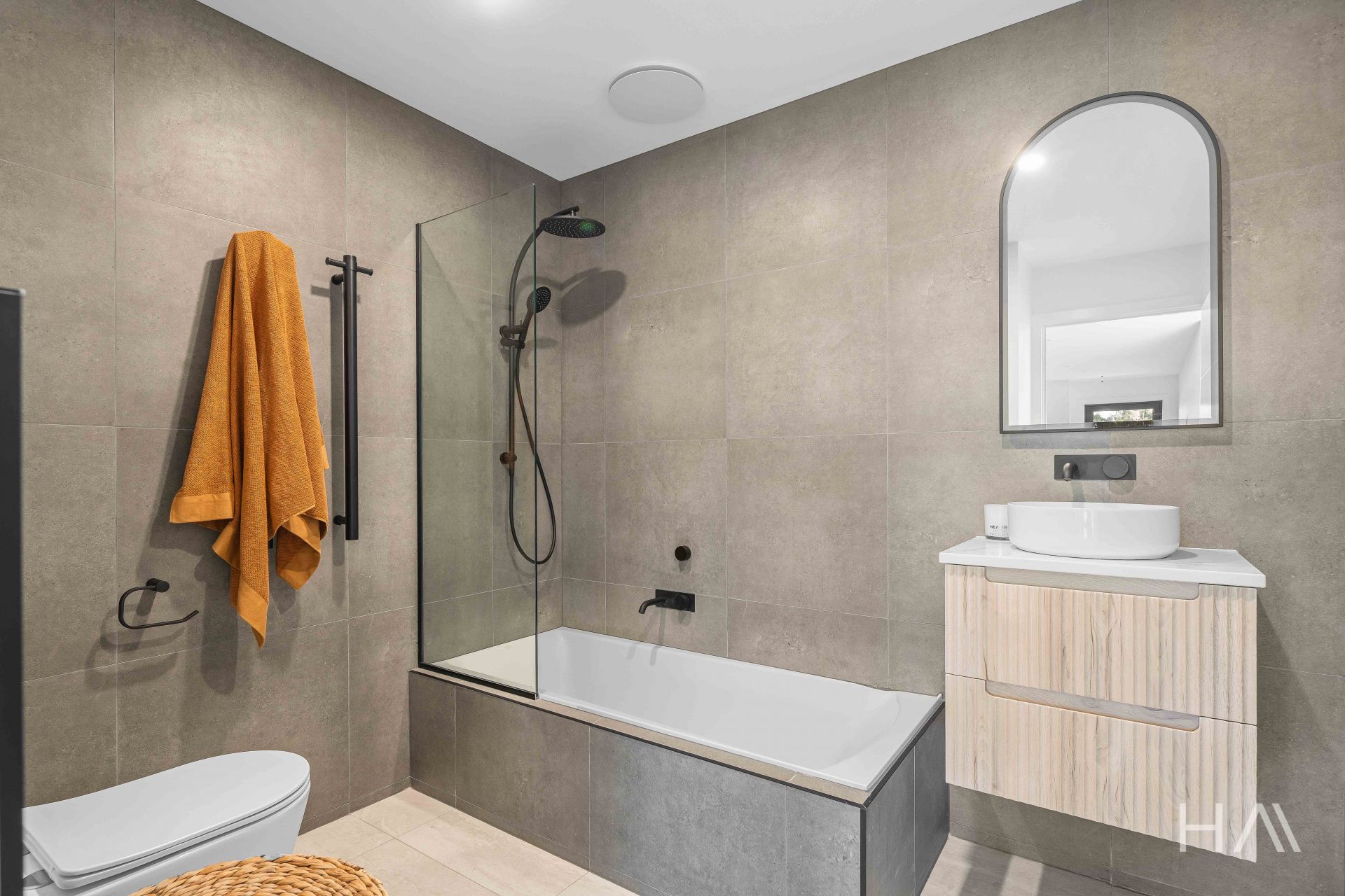 The upper level also houses the main bedroom with a walk-in robe and a luxurious ensuite featuring a large double vanity. A second bedroom with built-in robes and a separate bathroom completes this level, providing space and privacy for the whole family.