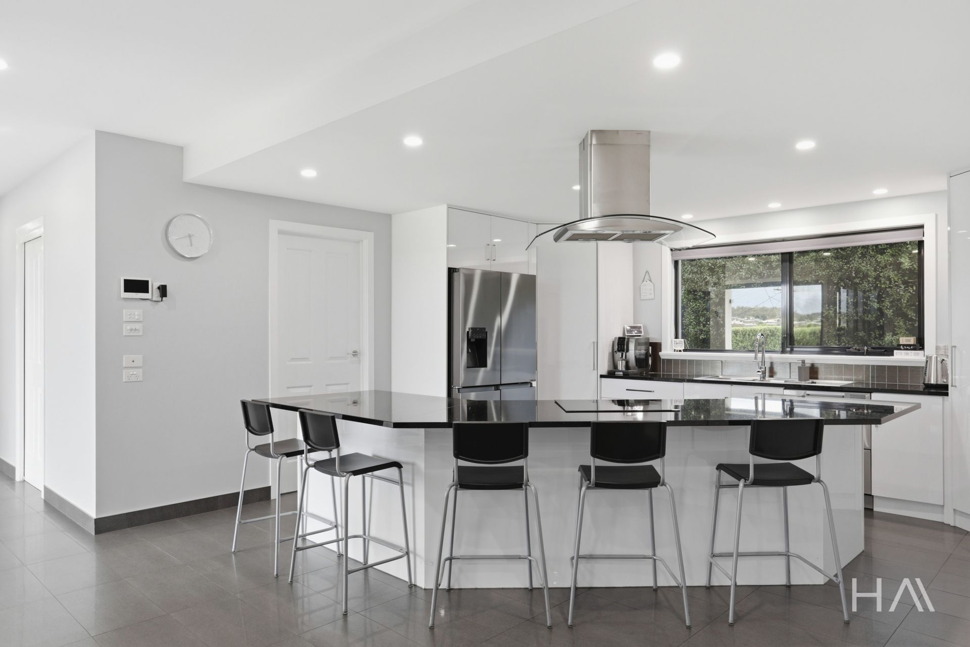 At the heart of the home, the centrally positioned chef’s kitchen is both striking and functional, adorned with elegant granite benchtops and quality appliances, creating a natural gathering point for family and guests alike.