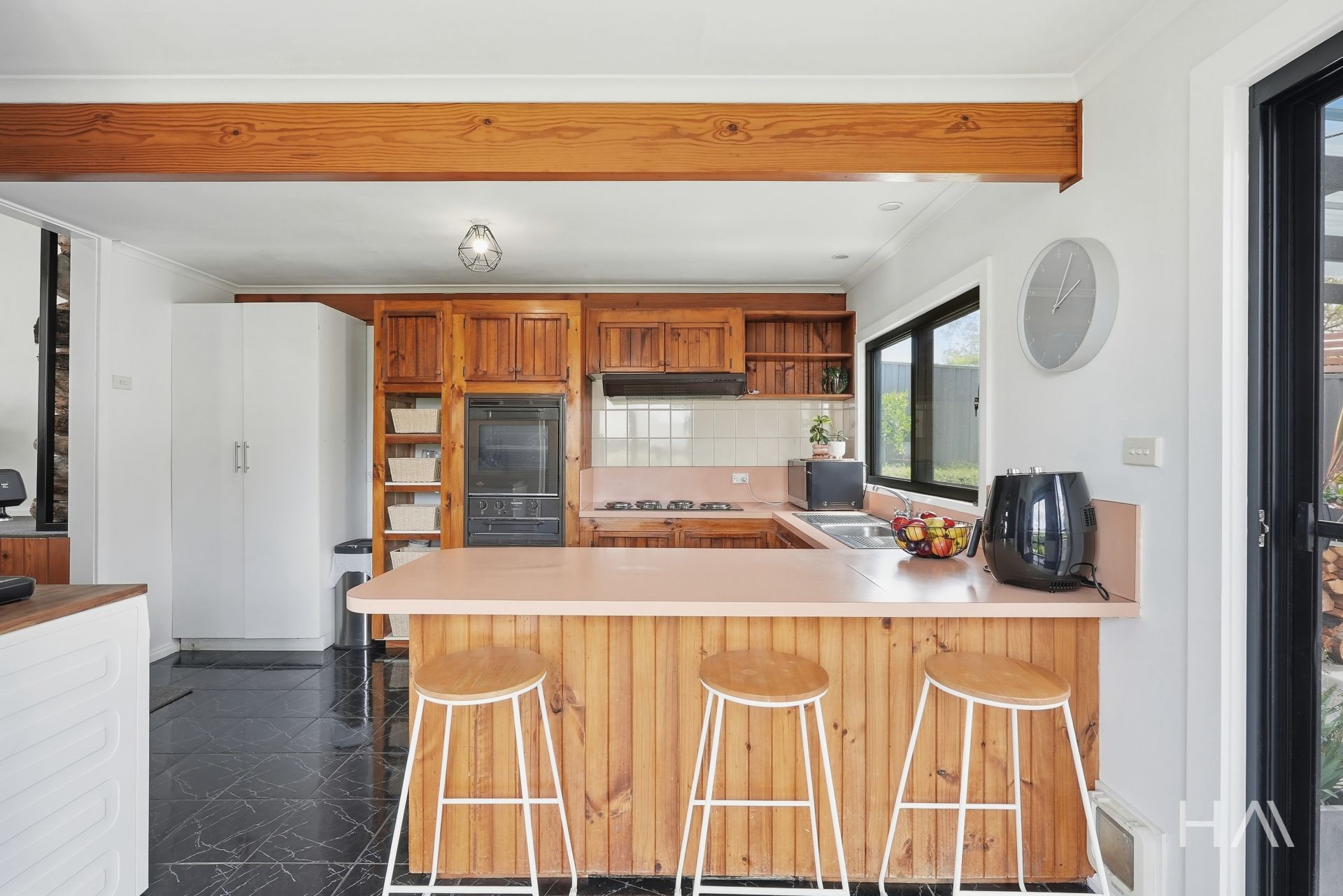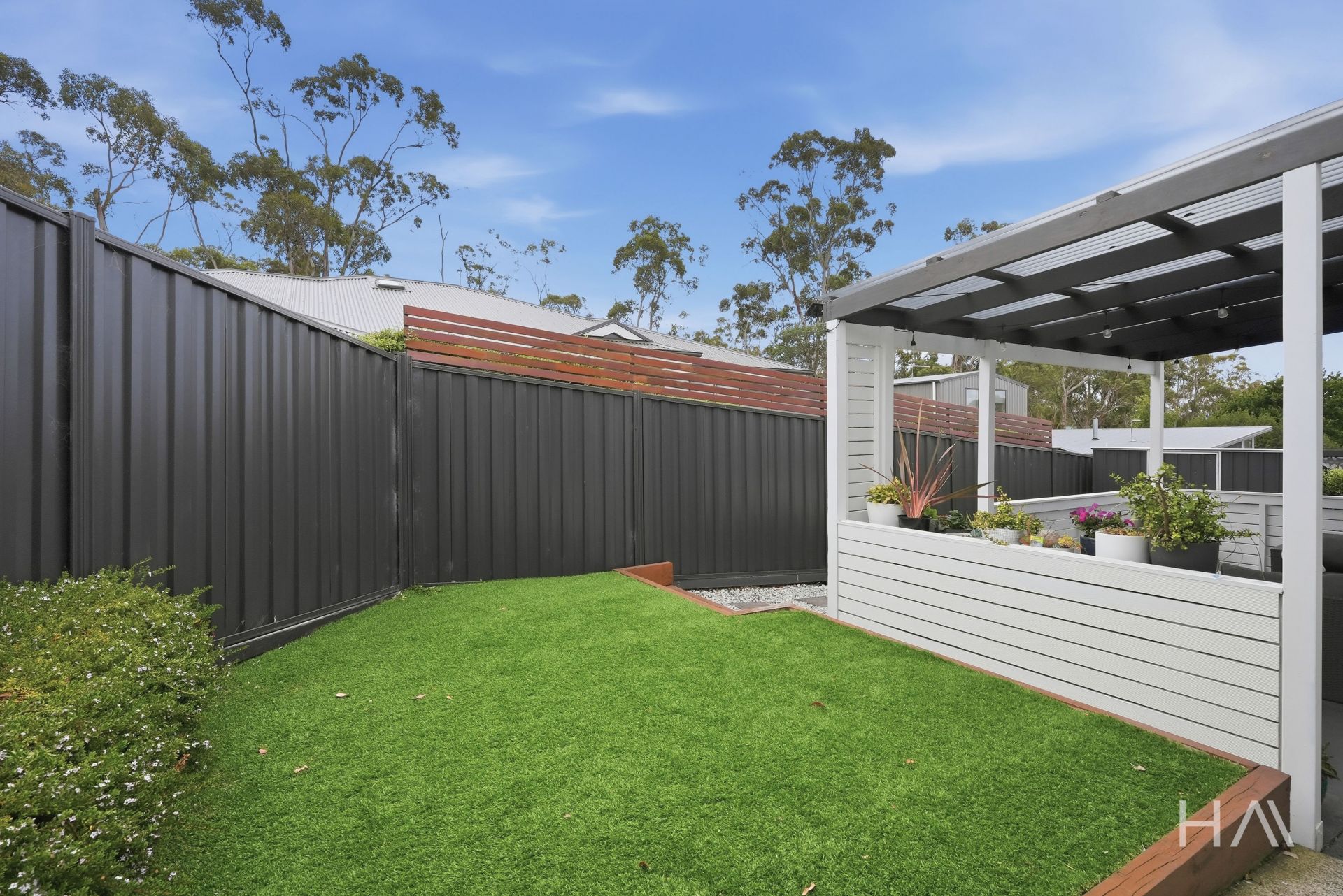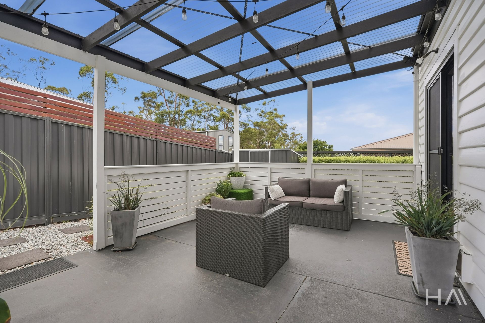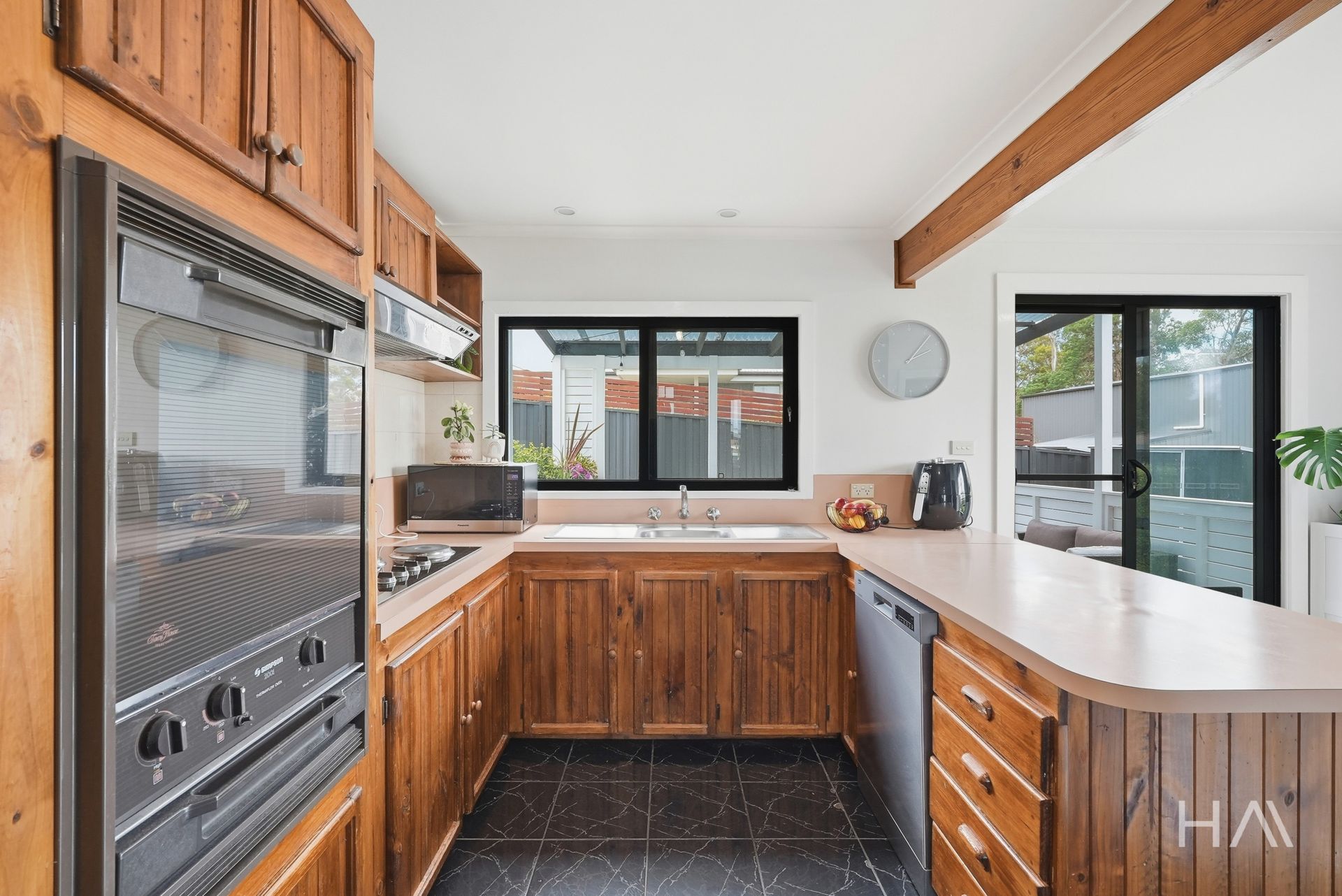 The kitchen and dining area connect directly to the covered patio, which sits at the centre of the outdoor space and works comfortably for daily meals or relaxed entertaining. From here, the fully fenced backyard extends beyond, providing a private and manageable outdoor area that’s easy to maintain.