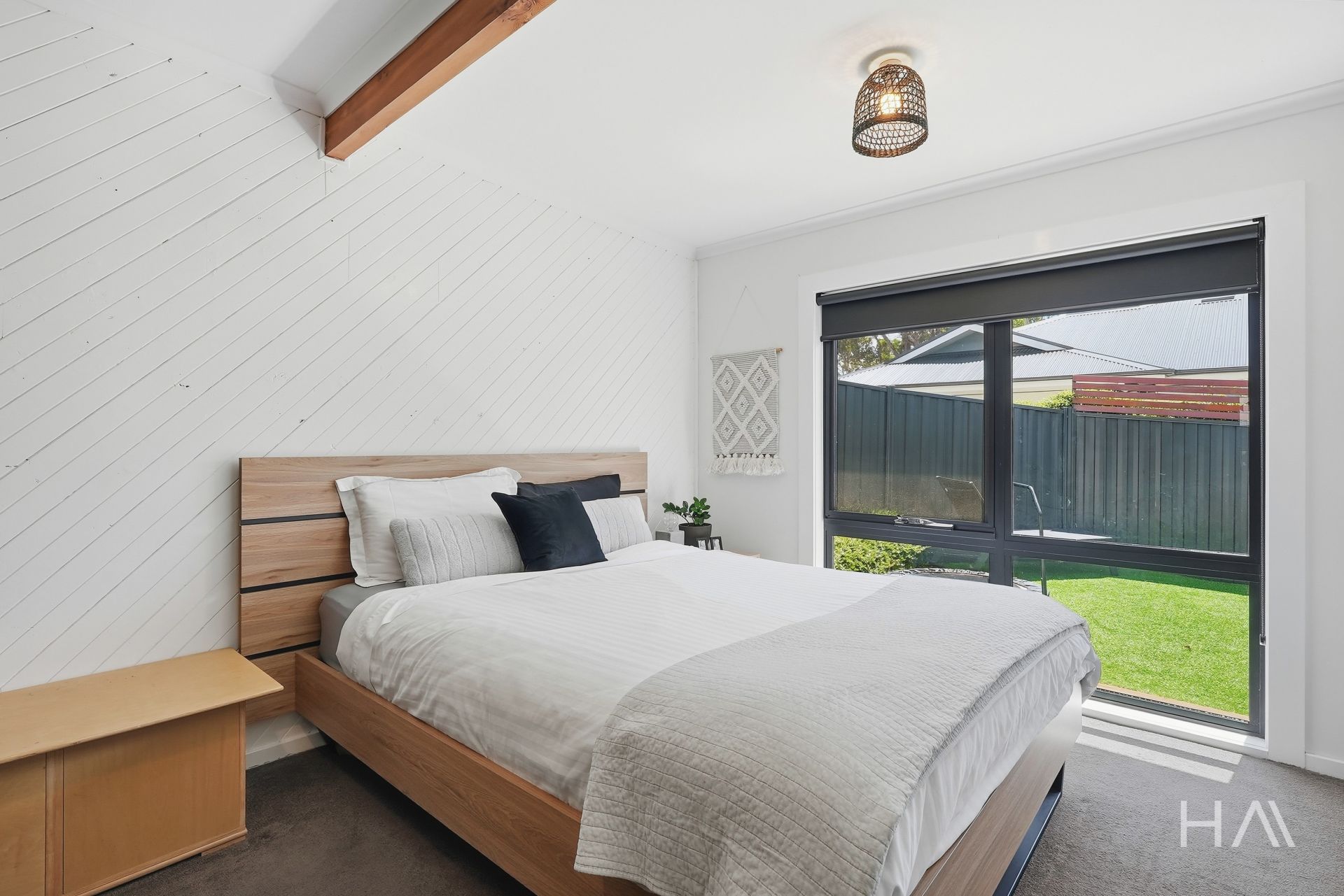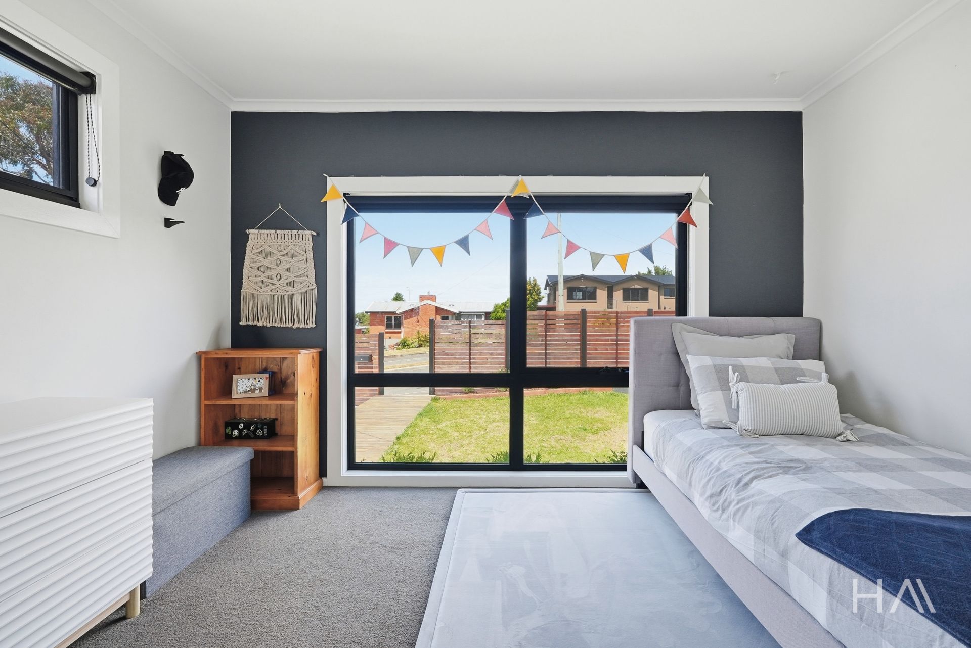 Three bedrooms and the central bathroom are located on the lower level, while the master bedroom occupies its own upper level, offering a quieter retreat away from the main living areas. Off-street parking for up to three vehicles is available via the open driveway and entry path.