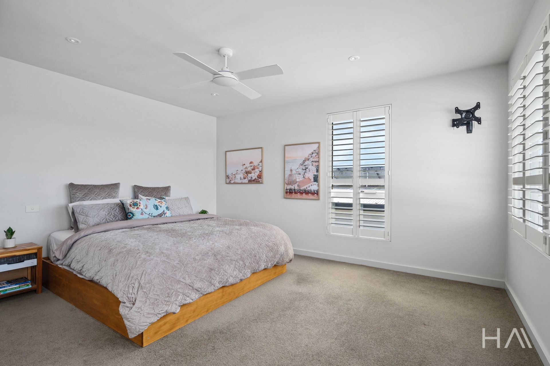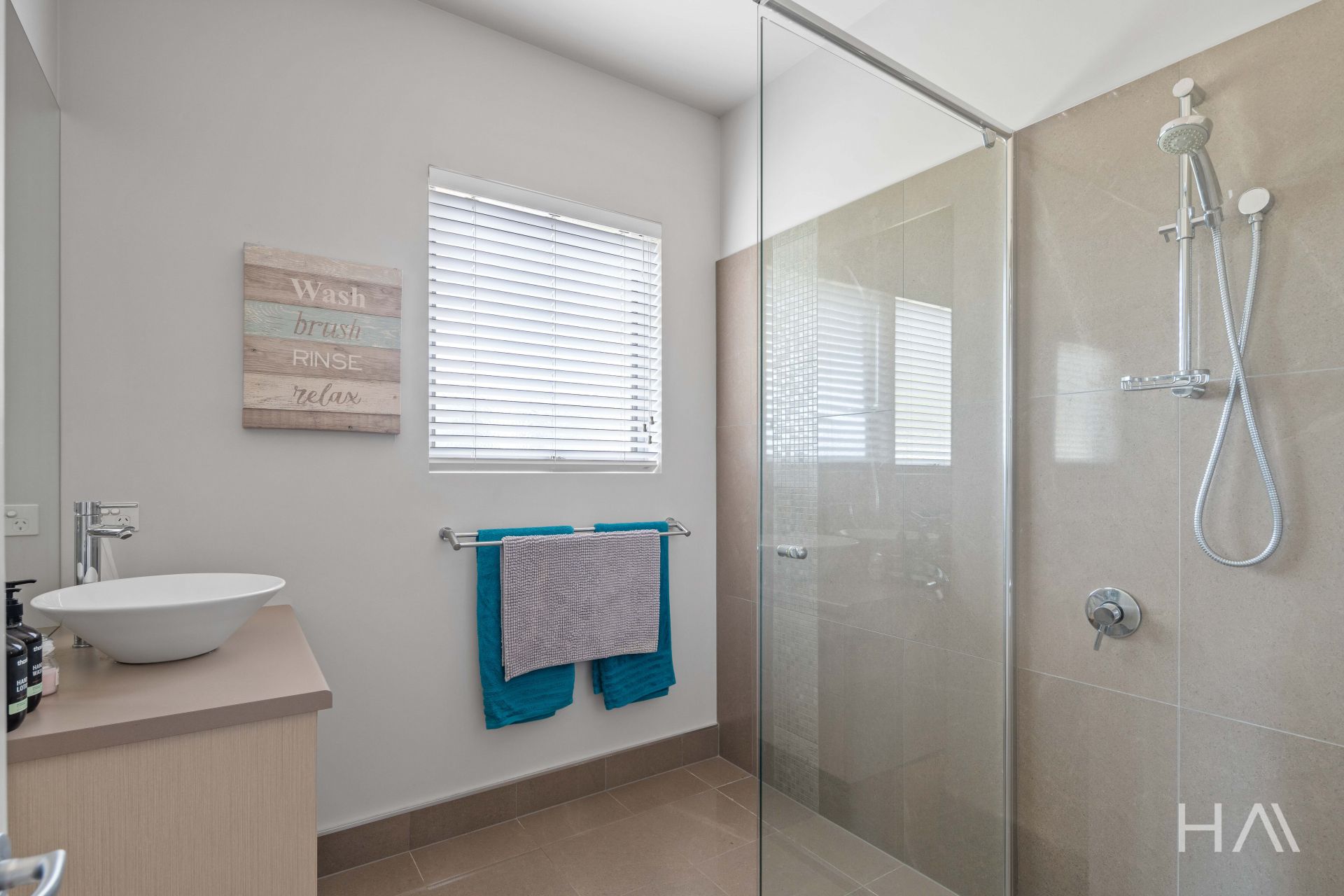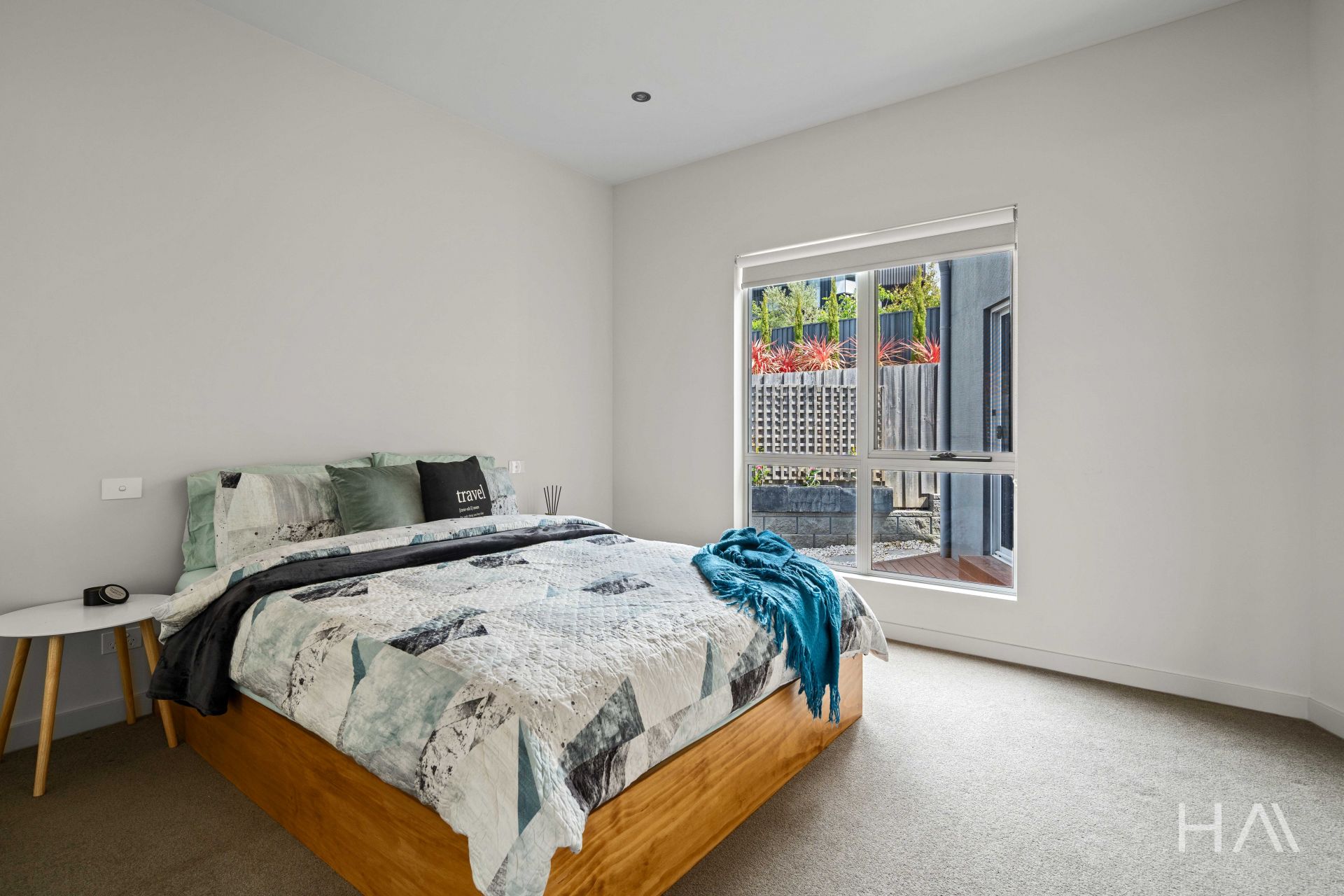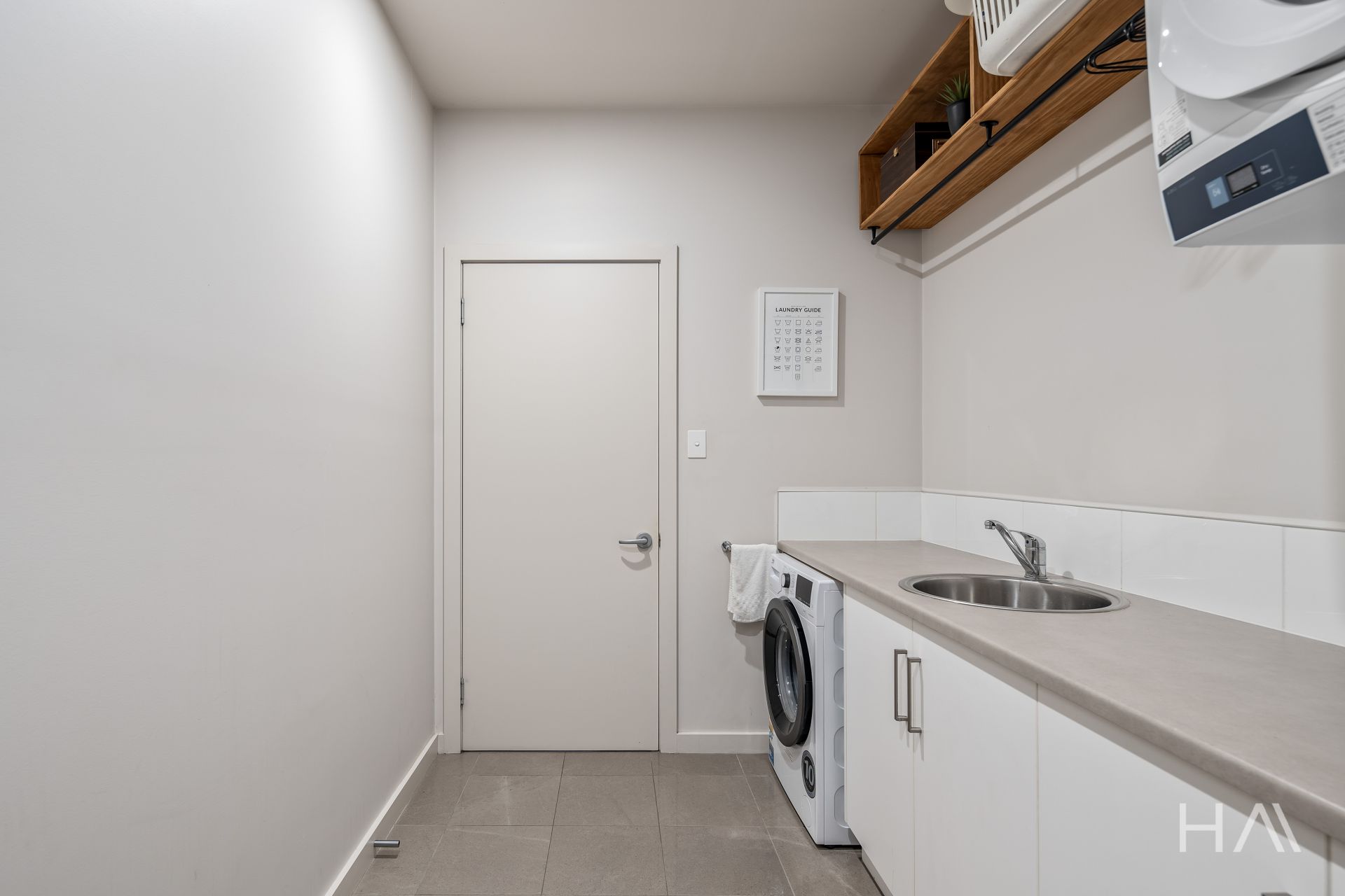 On the ground floor, two spacious bedrooms with built-in robes share a beautifully designed main bathroom, with the added convenience of a second toilet nearby. The thoughtfully planned laundry space keeps day-to-day tasks discreet and efficient. Upstairs, the main bedroom is a serene retreat, featuring a walk-in robe and luxurious ensuite-a true haven within the home.