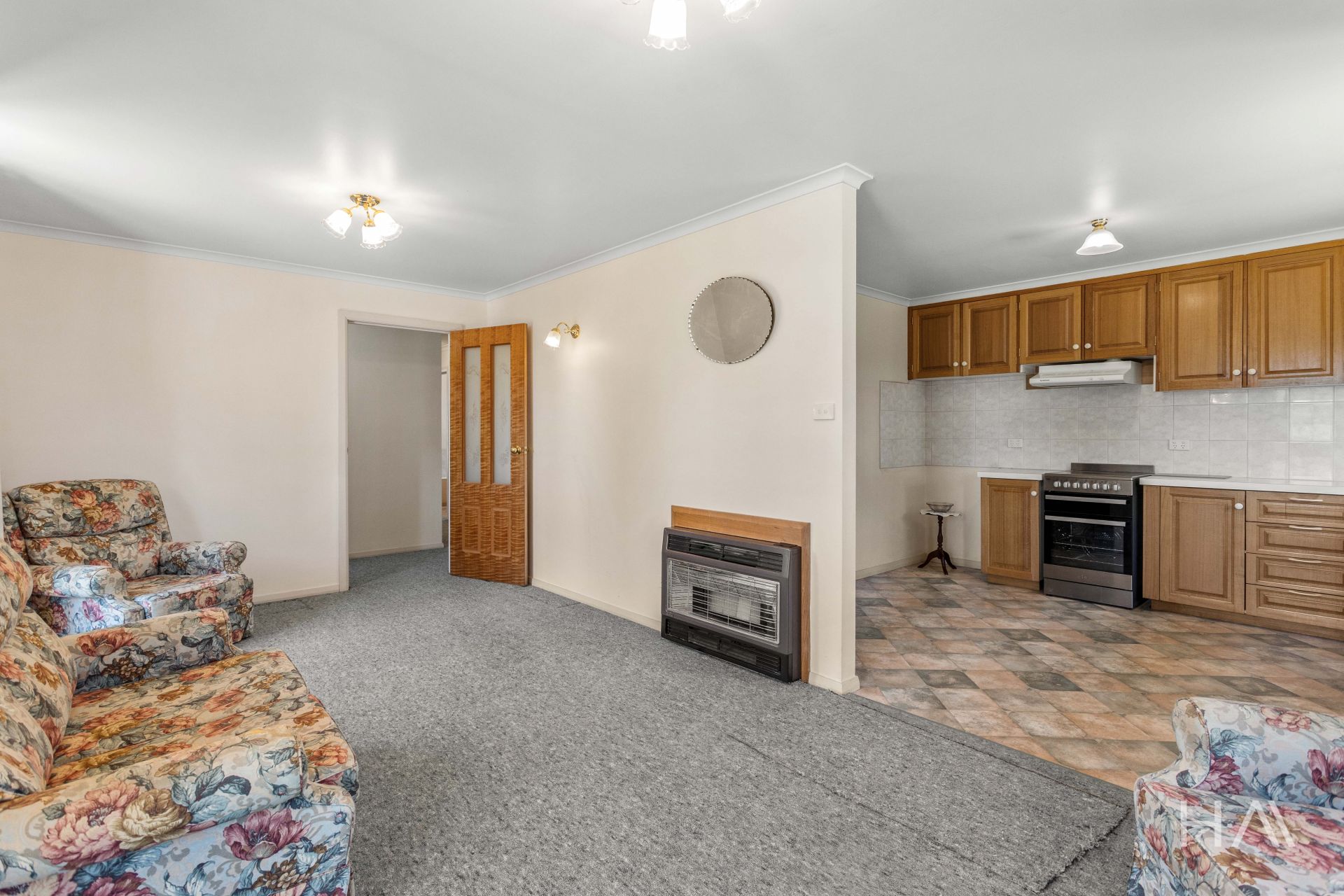 Inside, warmth and comfort are evident throughout. Character features and rich timber accents are complemented by a cosy gas heater, creating an inviting atmosphere that instantly feels like home.